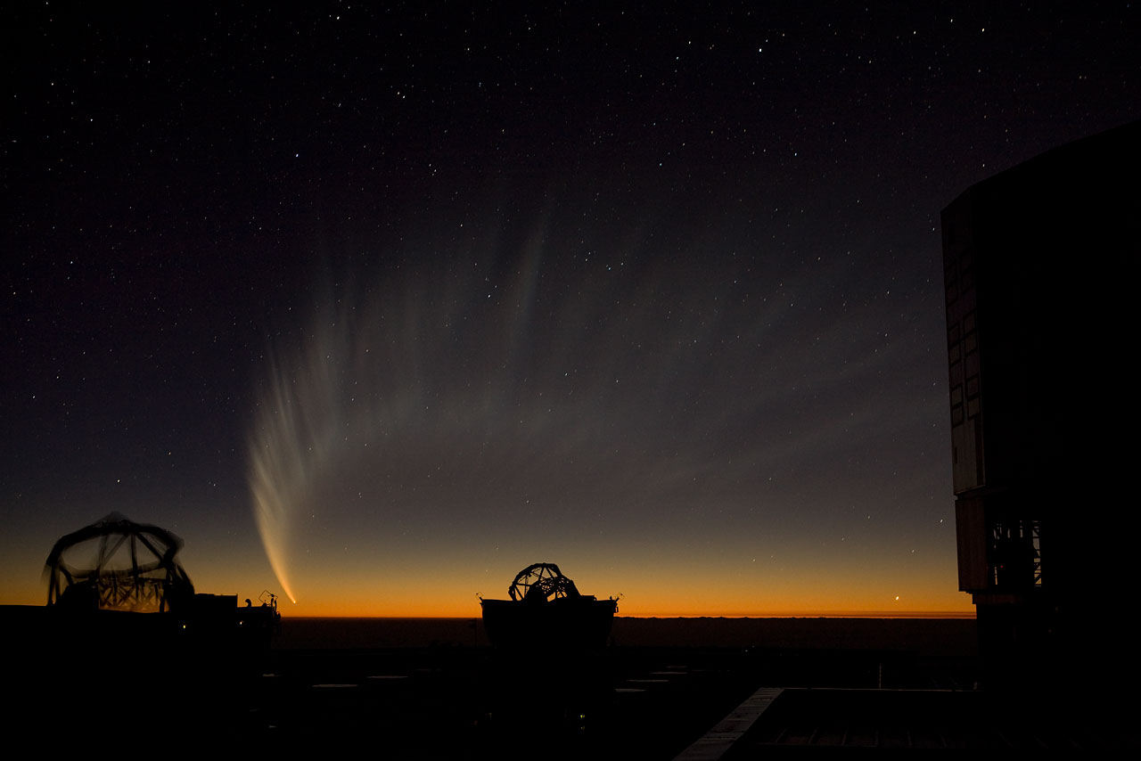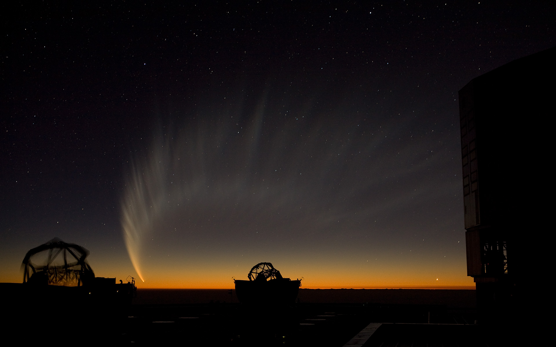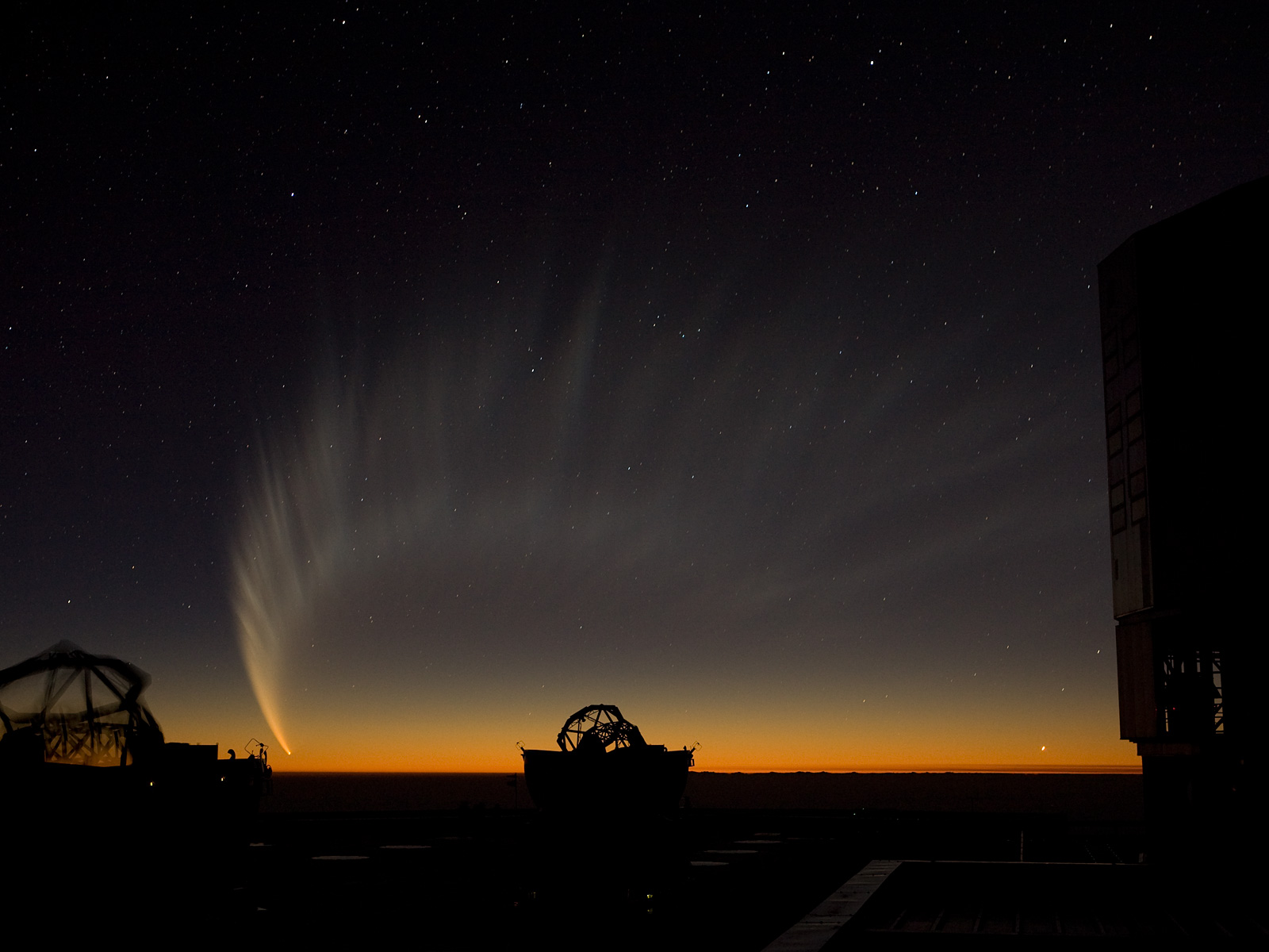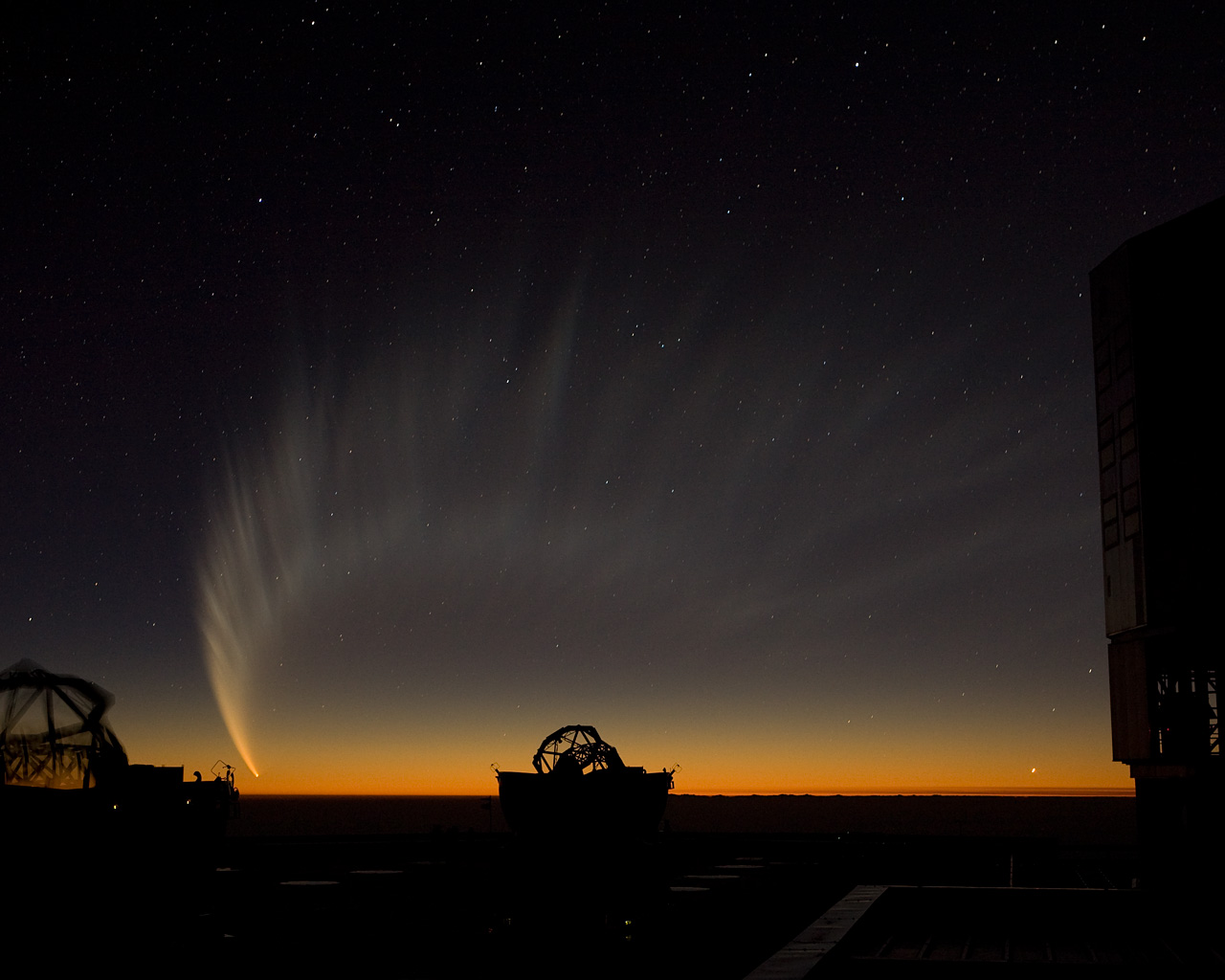 The prominent tail of Comet McNaught made a spectacular view over the VLT platform in January 2007.