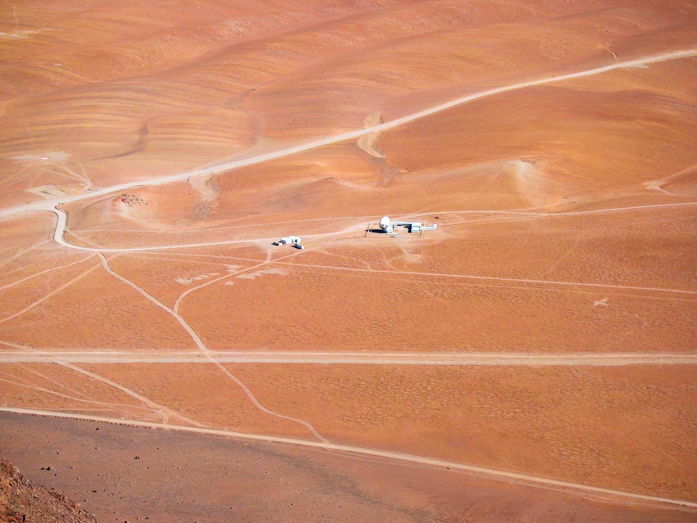 From atop Cerro Chajnantor, the Chajnantor facilities for APEX appear tiny and isolated. Even the largest submillimetre-wavelength telescope operating in the southern hemisphere appears dwarfed by the vast plateau on which it resides.
