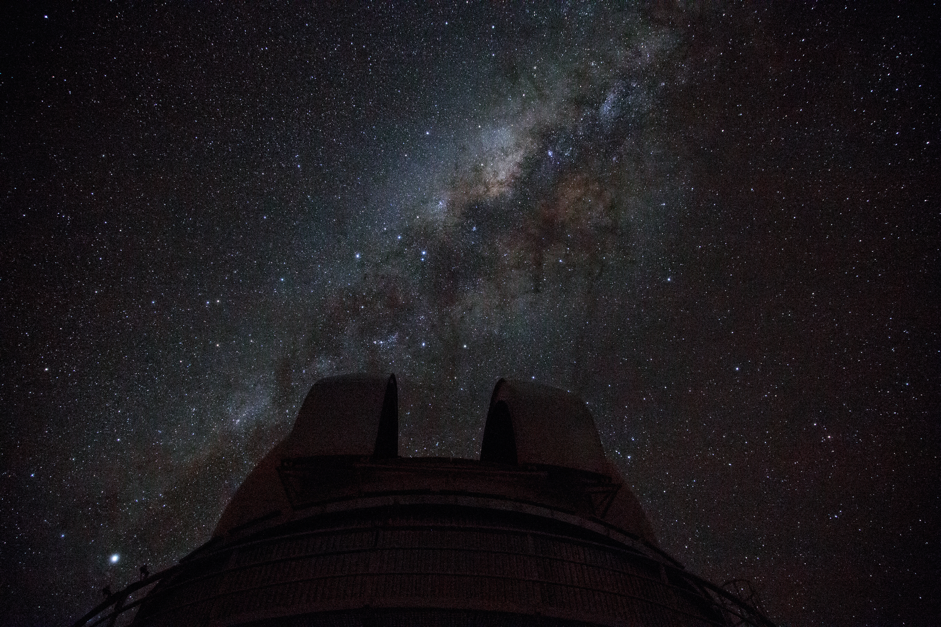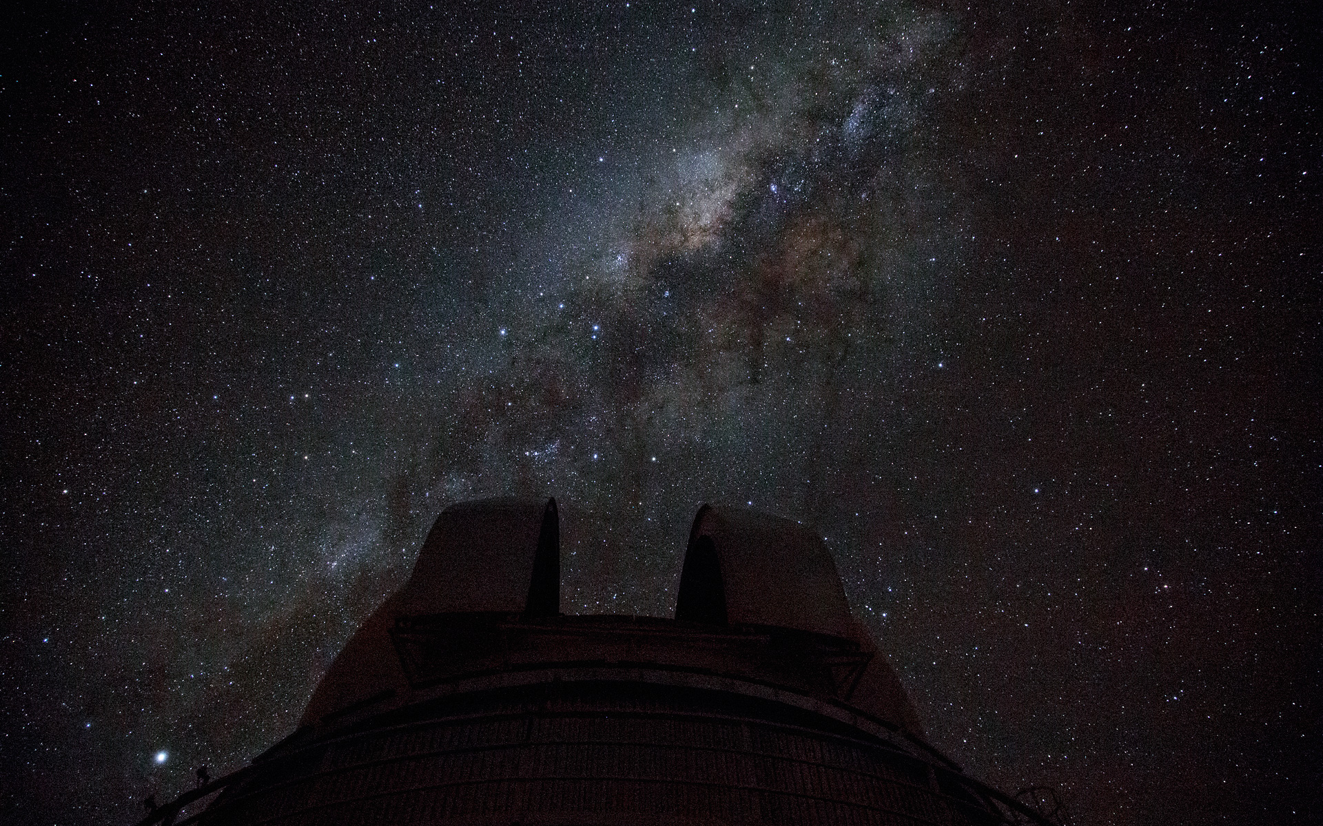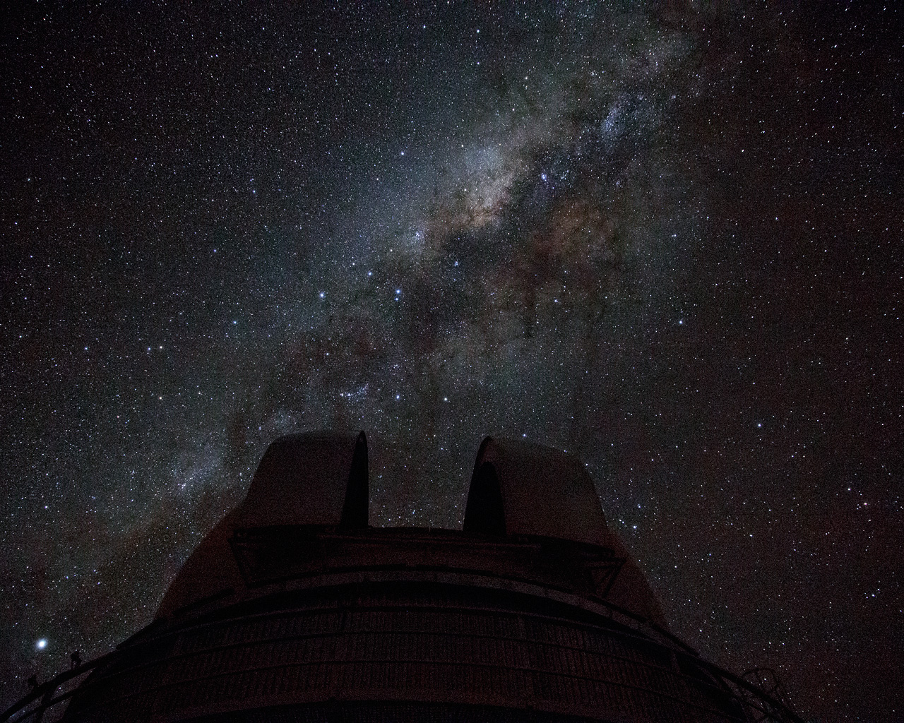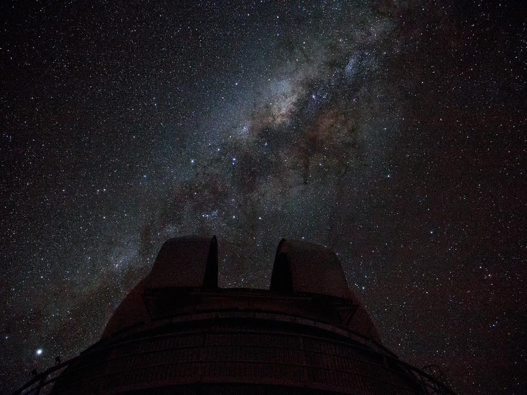 This image shows the Milky Way arching above the ESO 1-metre Schmidt Telescope at the La Silla observatory. La Silla is located on the outskirts of the Chilean Atacama Desert, 600 km north of Santiago de Chile and at an altitude of 2400 metres. Set so far from light pollution the site has one of the darkest night skies on Earth.