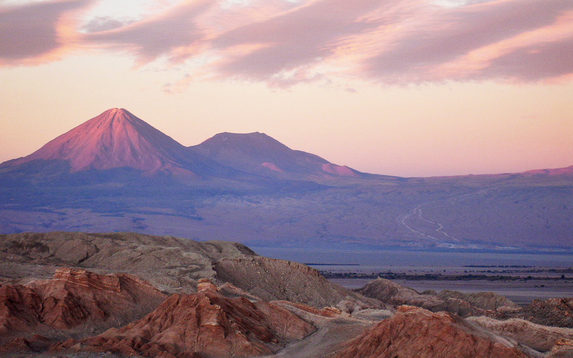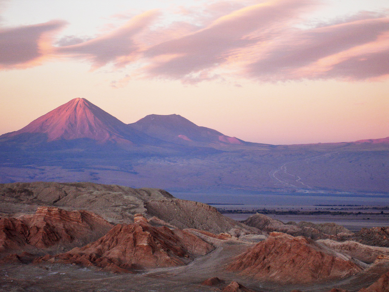 This is the Chajnantor Plateau lit by sunset. The Plateau is in Chile's Atacama Desert at an altitude of 5000 metres. In the distance can be seen the Licancabur volcano, dominating the sky line at an incredible 5920 metres above sea level.