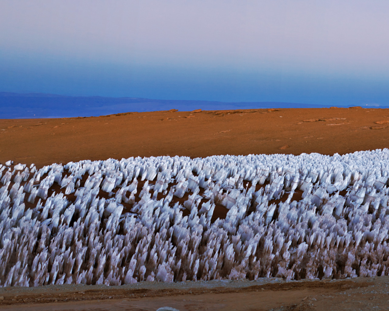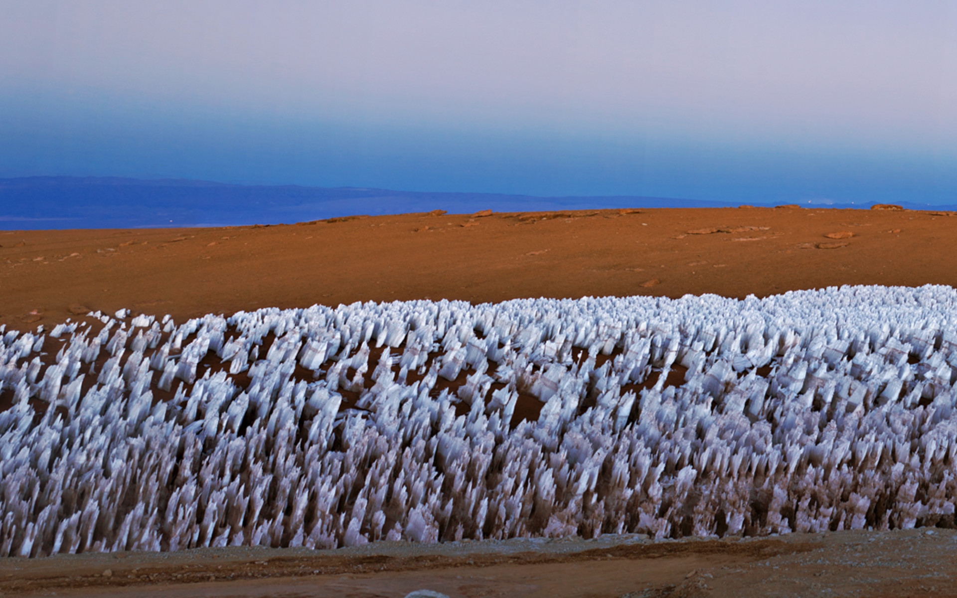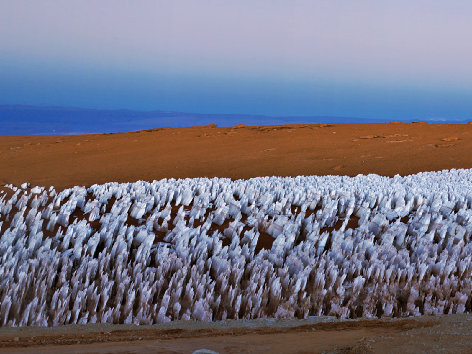 A panoramic view of the Licancabur volcano, straddling Chile and Bolivia, close to the ALMA site. The ice figures in the ground are called "penitentes", a curious natural phenomenon found in high-altitude regions. They are thin spikes of hardened snow or ice, with sharp edges pointing towards the Sun, reaching heights from a few centimetres up to several metres