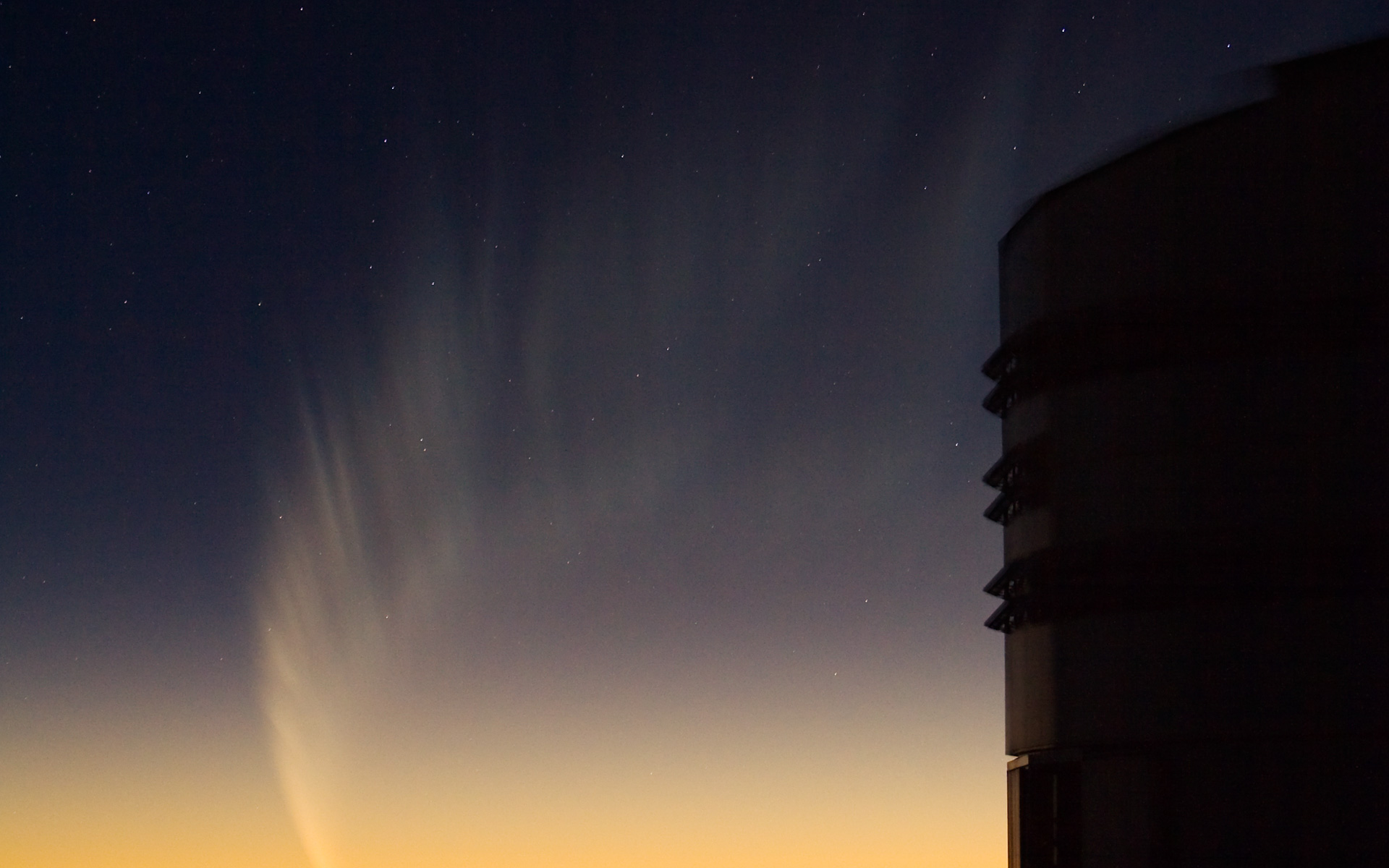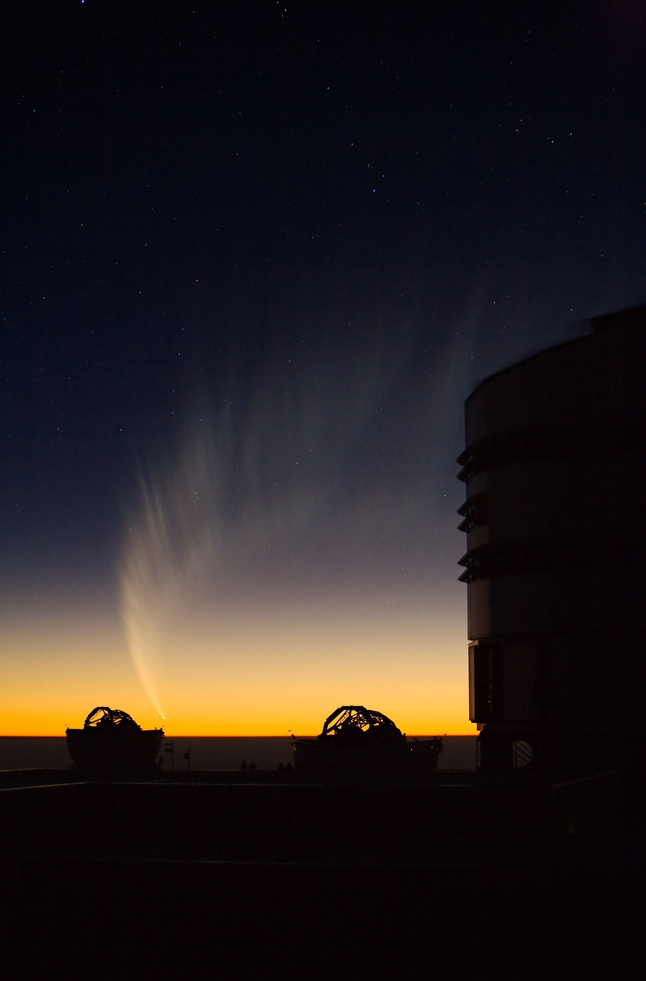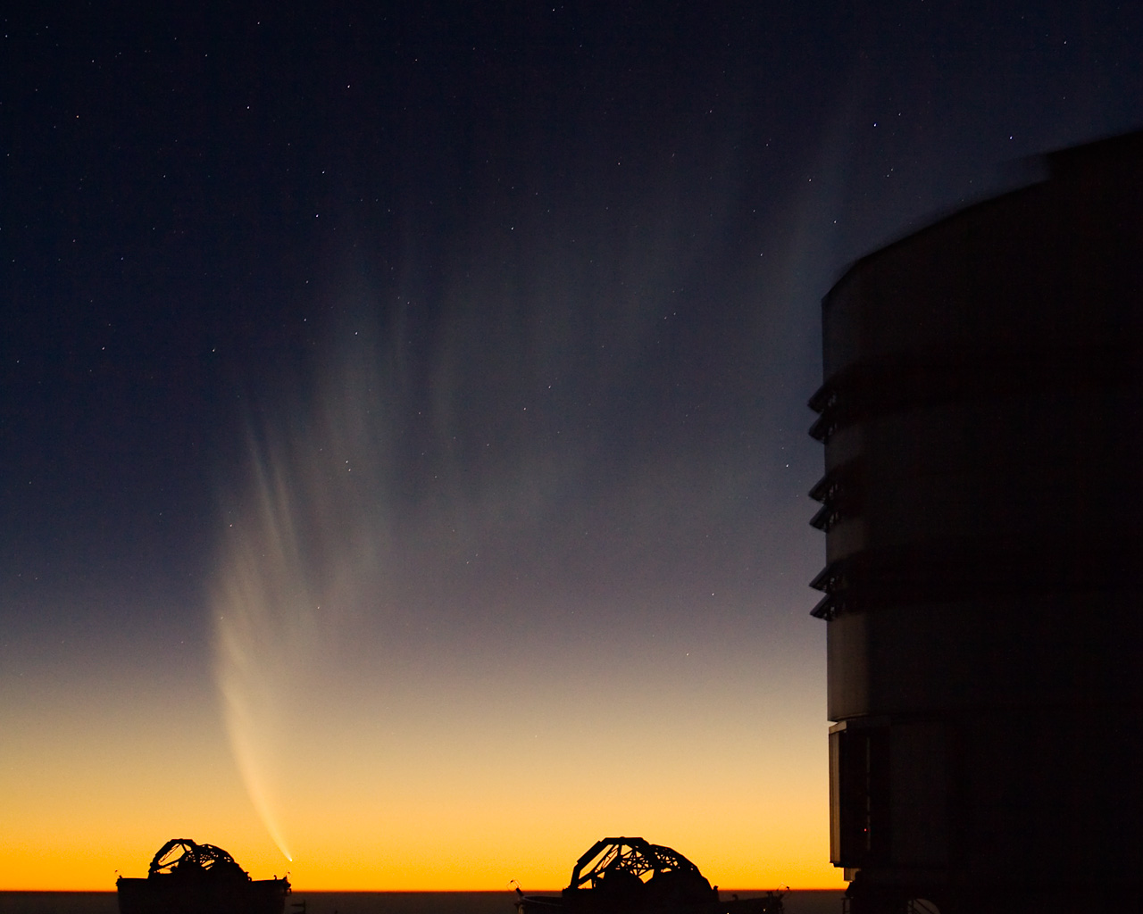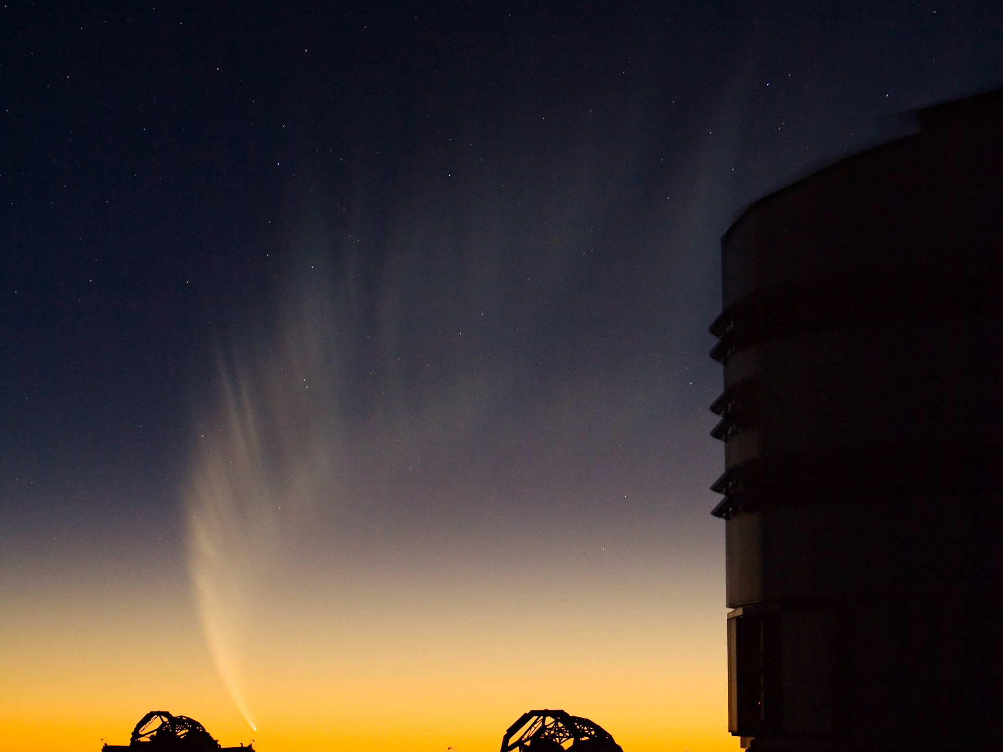 The gigantic tail of Comet McNaught covered over 70 degrees in the evening sky of late January 2007. In the foreground, one sees the silhouette of two Auxiliary Telescopes and part of the enclosure of ANTU, the first VLT Unit Telecope.