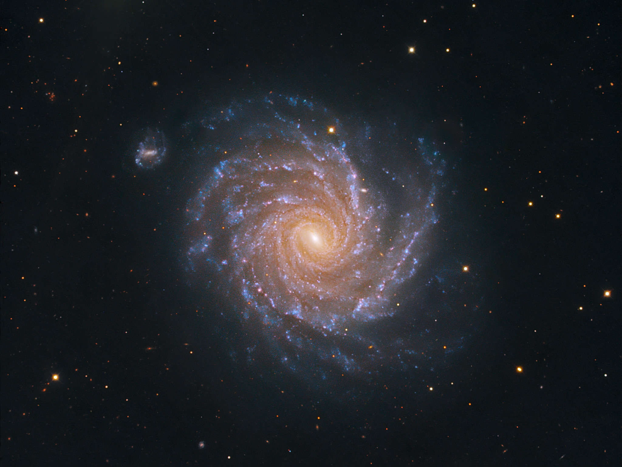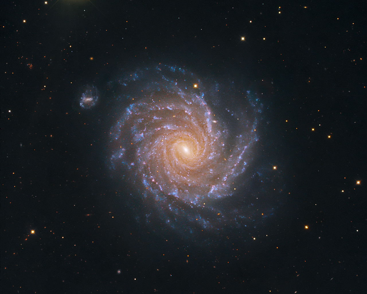 The pair is located roughly 70 million light-years away in the constellation Eridanus (The River). Billions of stars and dark dust are caught up in this beautiful gravitational swirl. The blue spiral arms with their many young stars and star-forming regions make a striking contrast with the yellow-reddish core of older stars.