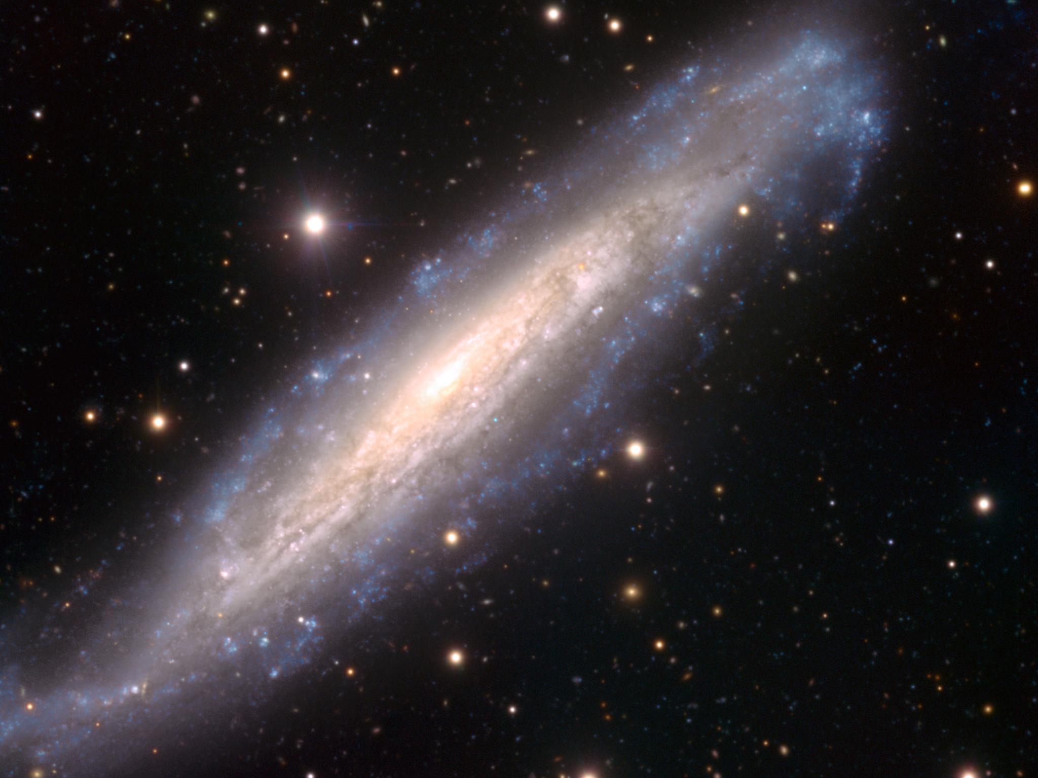 Portrayed in this beautiful image is the spiral galaxy NGC 1448, with a prominent disc of young and very bright stars surrounding its small, shining core. Located about 60 million light-years away from the Sun, this galaxy has recently been a prolific factory of supernovae, the dramatic explosions that mark the death of stars : after a first one observed in this galaxy in 1983, two more have been discovered during the past decade.