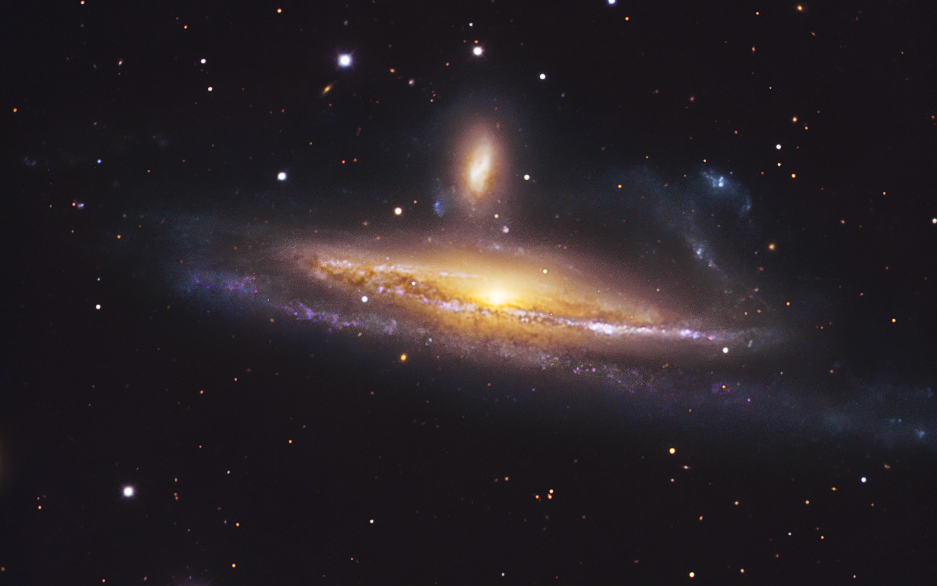 The pair of galaxies NGC 1531/2, engaged in a spirited waltz, is located about 70 million light-years away towards the southern constellation Eridanus (The River). The deformed foreground spiral galaxy laced with dust lanes NGC 1532 is so close to its companion — the background galaxy with a bright core just above the centre of NGC 1532 — that it gets distorted: one of its spiral arms is warped and plumes of dust and gas are visible above its disc. The cosmic dance leads to another dramatic effect: a whole new generation of massive stars were born in NGC 1532 because of the interaction. They are visible as the purple objects in the spiral arms.