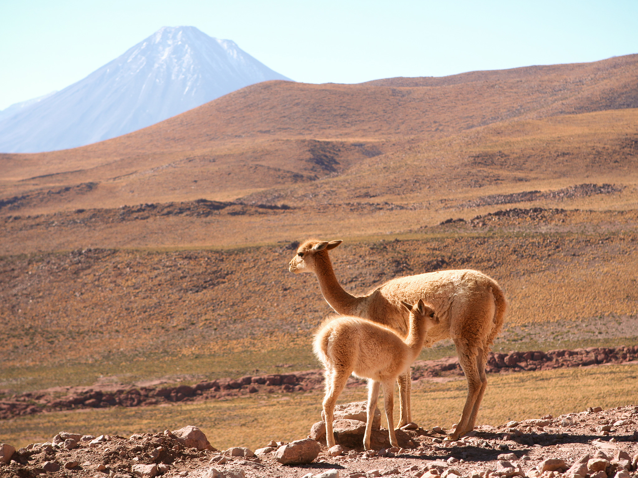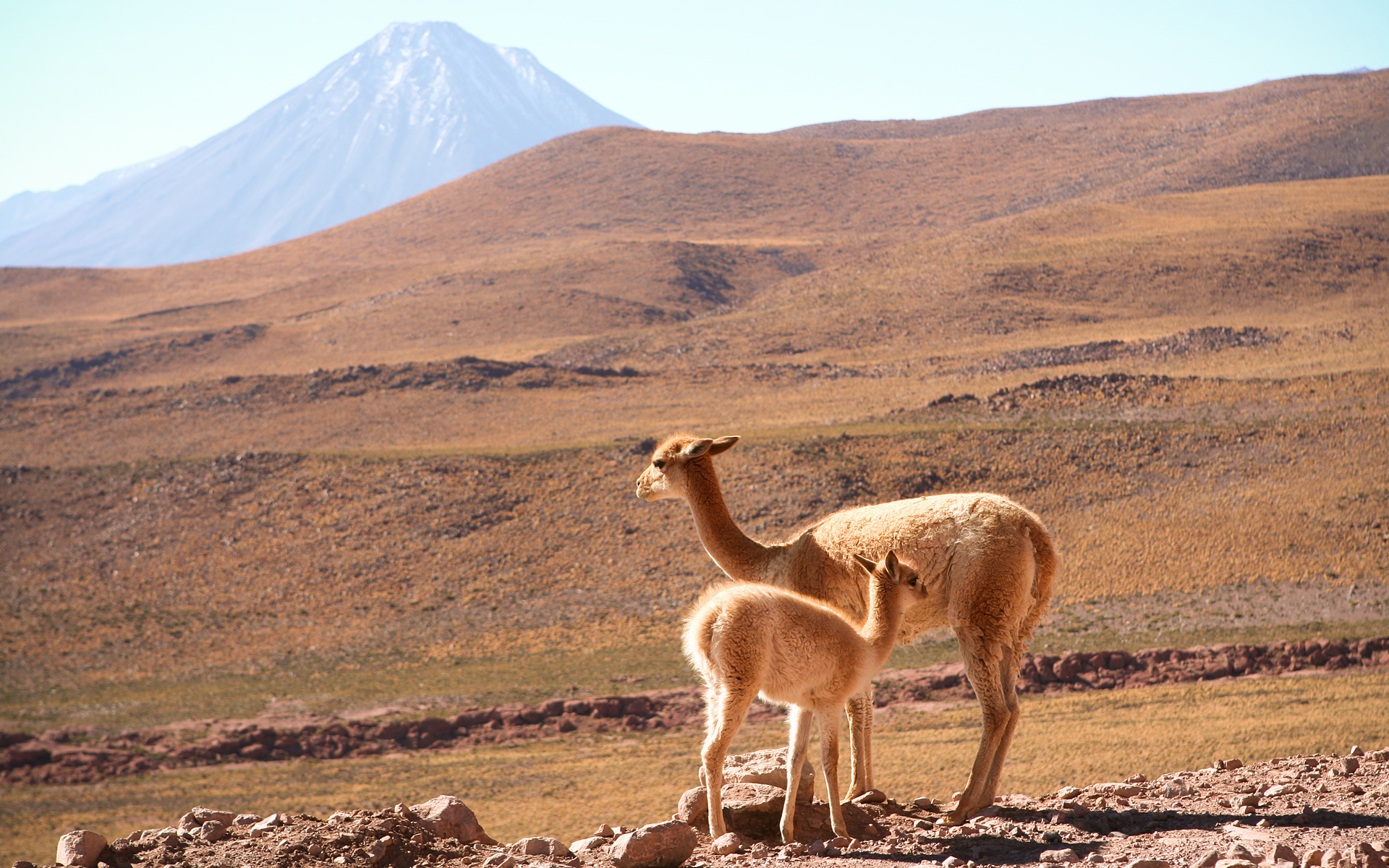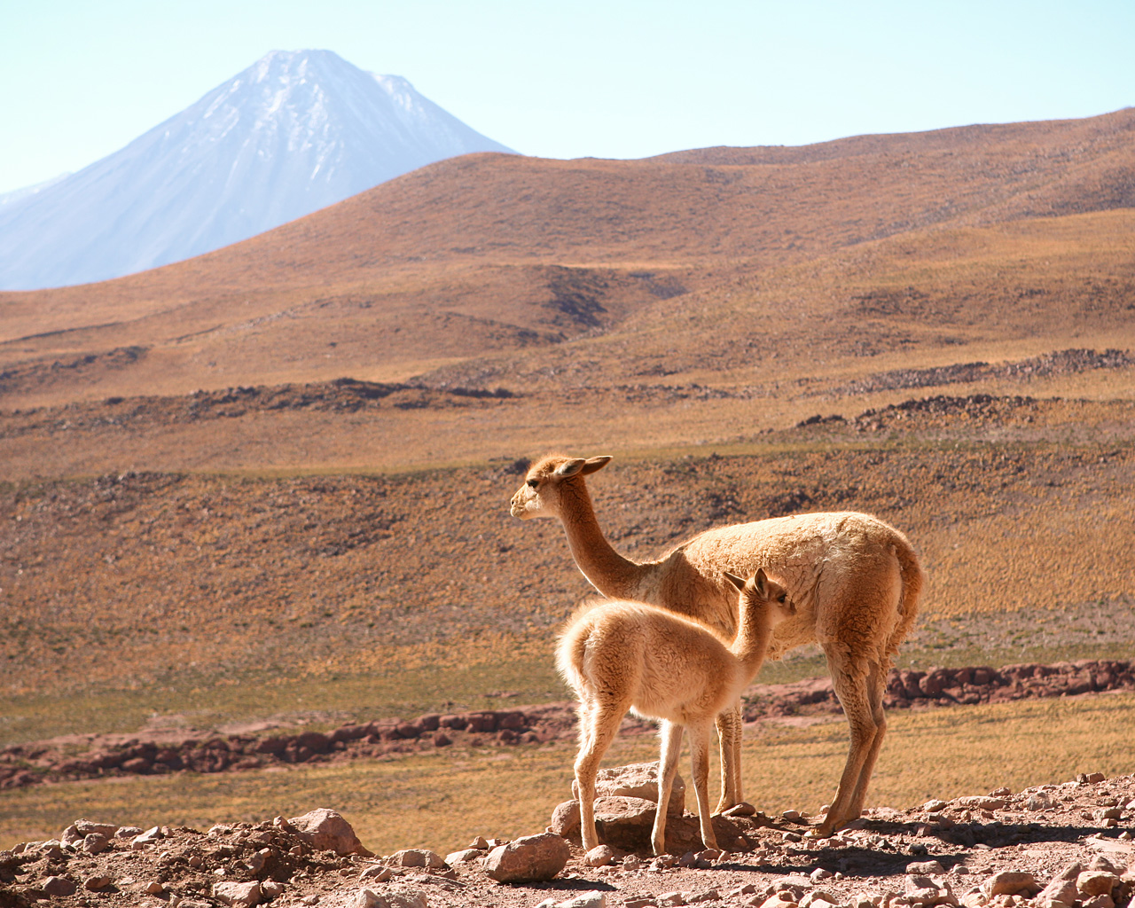 Two vicuñas in Chile's Atacama region, near the APEX telescope facility. In the background is the volcano Licancabur.