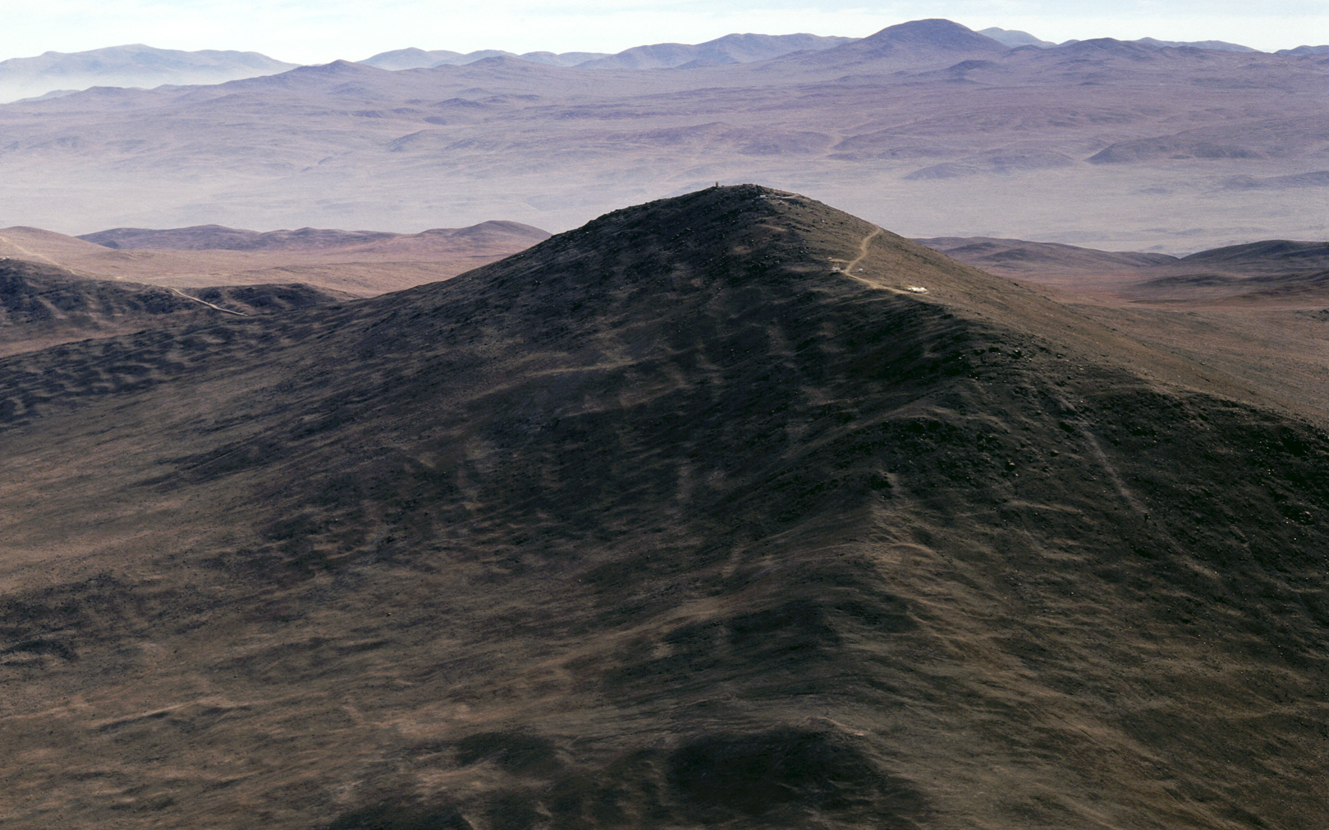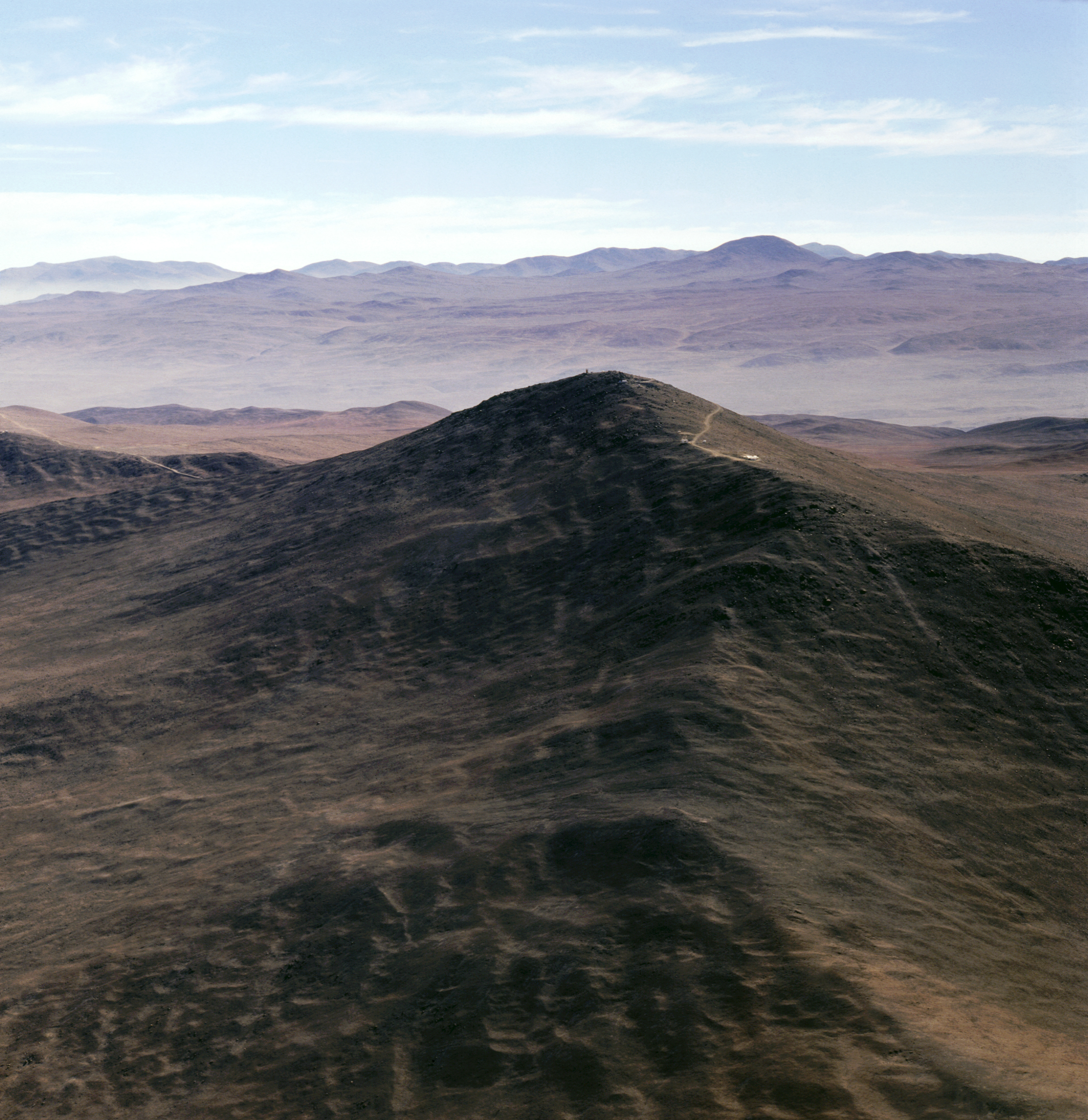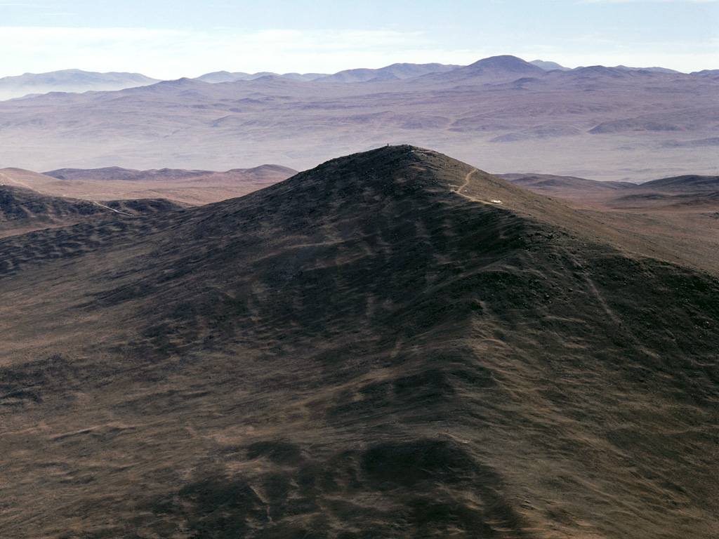 Before the VLT construction, the top of Paranal's summit was a sharp peak, as seen on this 1991 aerial shot. It had to be truncated by about 40m to create a wide platform.