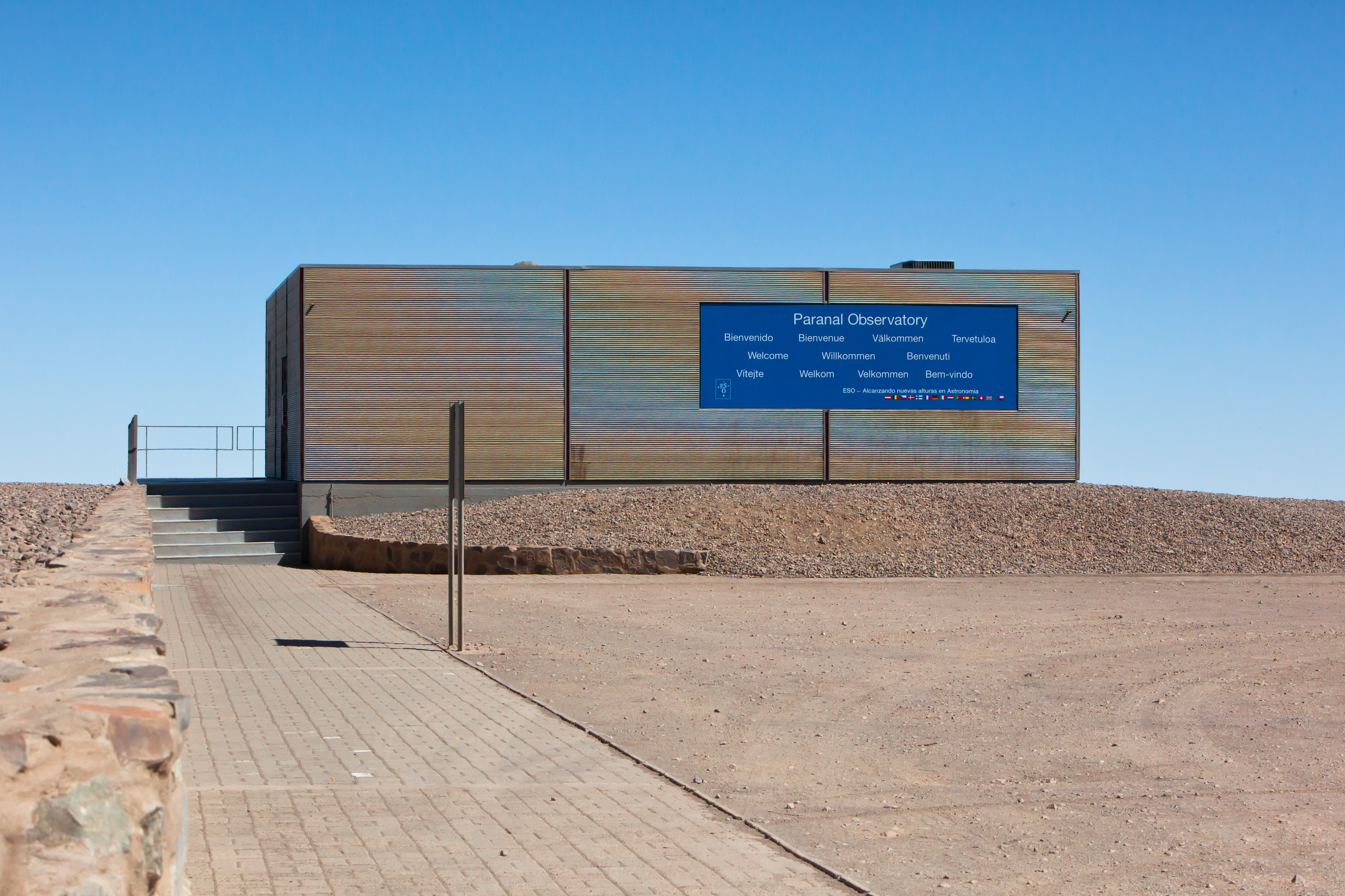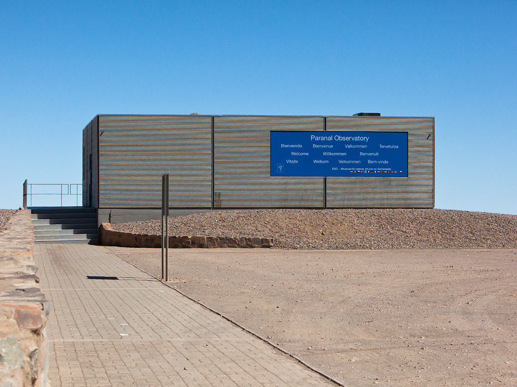 This building greets visitors at ESO's Paranal Observatory, some 120 km south from Antofagasta, in the II Region of Chile. Located on the left after the observatory's main gate, the visitor centre offers backlit panels, a model of the VLT and a room where introductory videos are projected. Tourist and student visits to Paranal Observatory are scheduled for every Saturday.