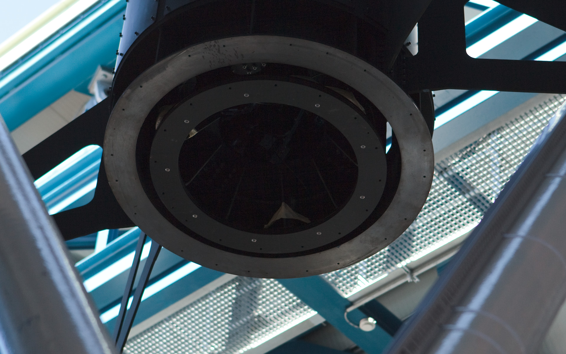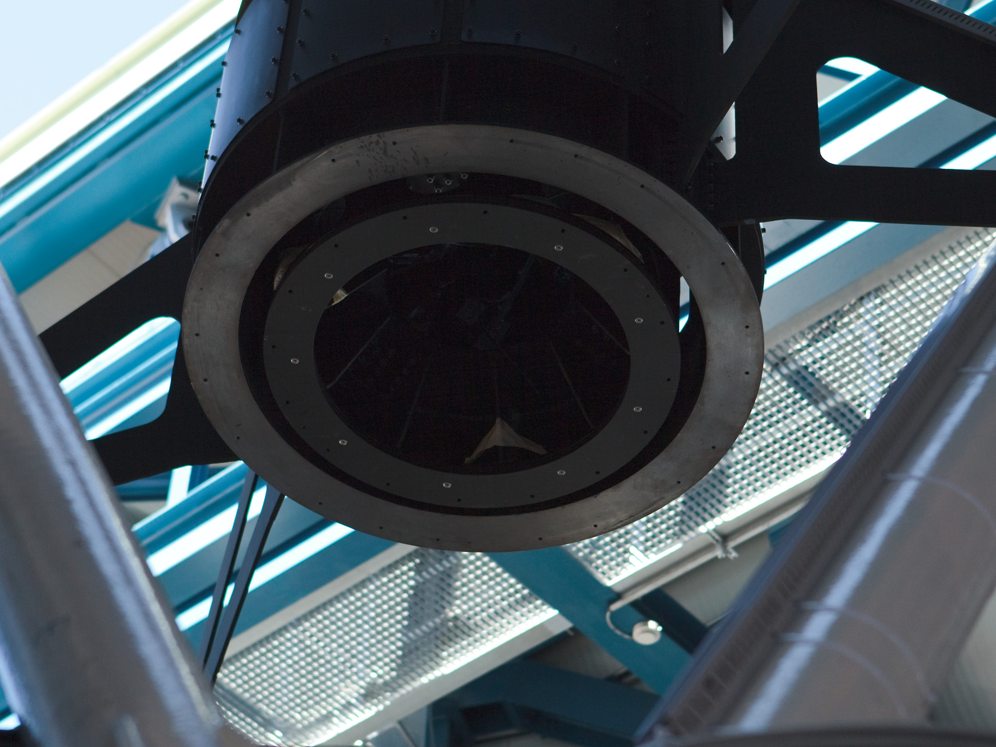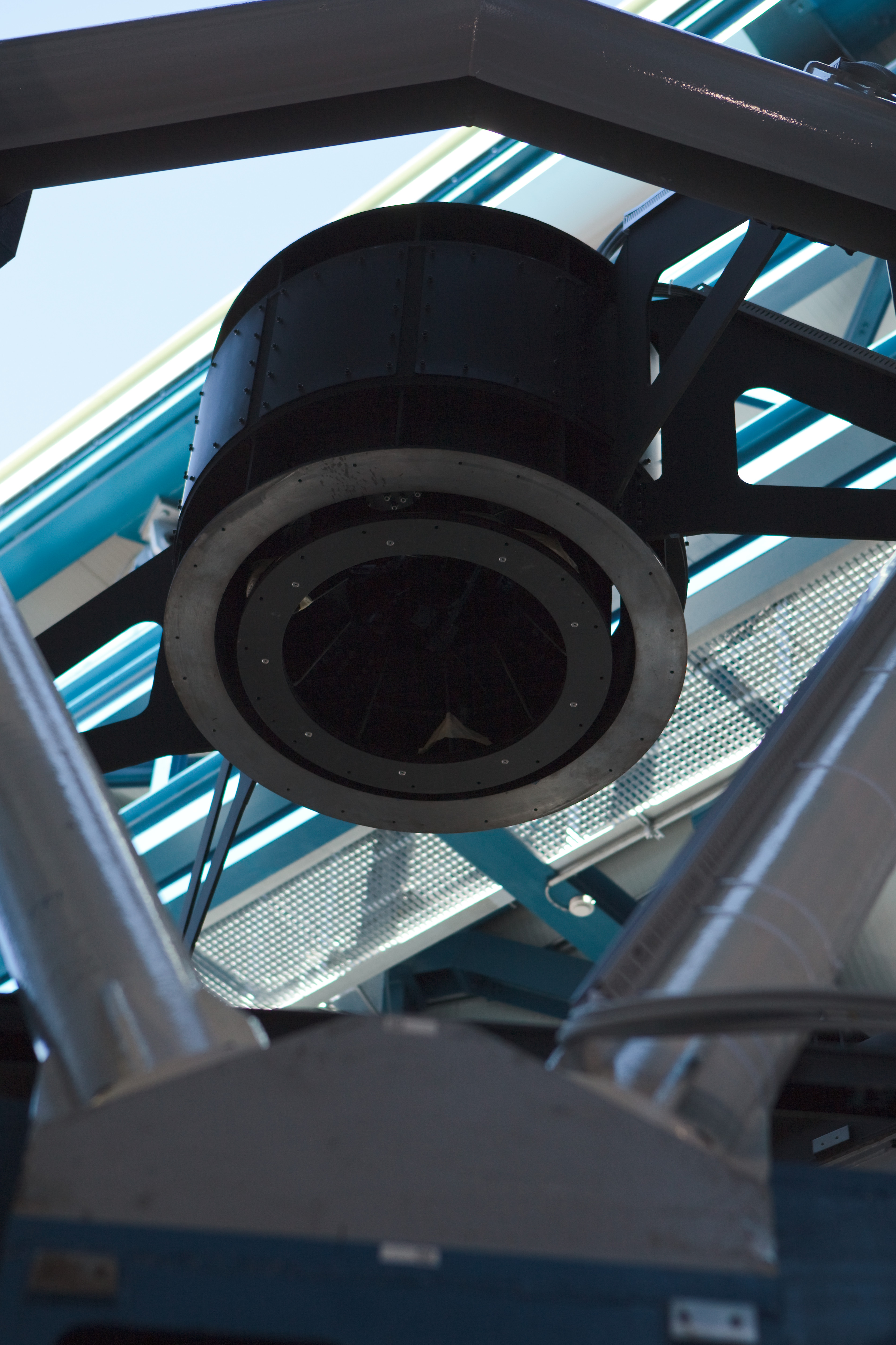 A hexapod structure in the VLT Survey Telescope (VST) at Paranal. This hexapod helps rotate the secondary mirror in a technique known as "chopping" that improves observational efficacy. The VST is a state-of-the-art 2.6 m telescope equipped with OmegaCAM, a monster 268 megapixel CCD camera with a field of view four times the area of the full Moon. This image was obtained in March 2009.