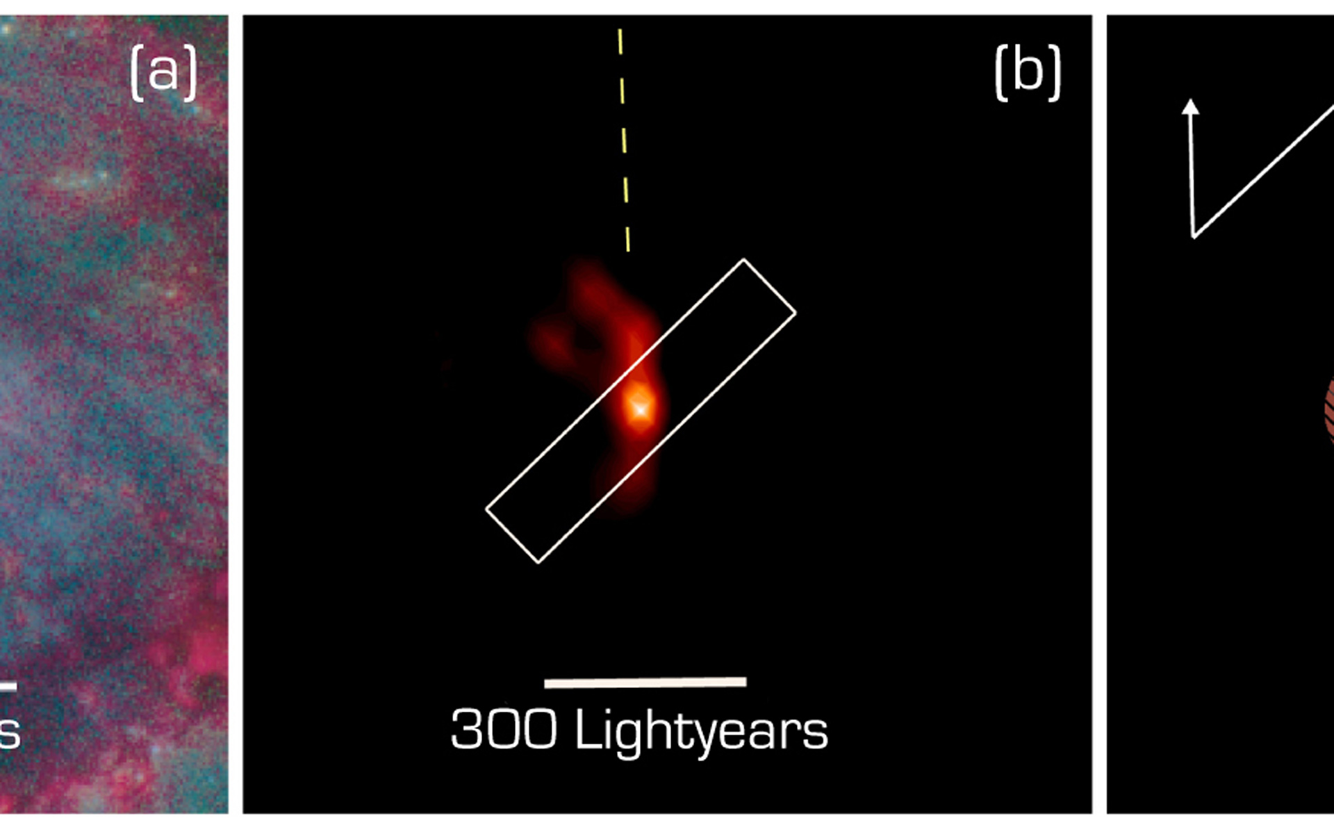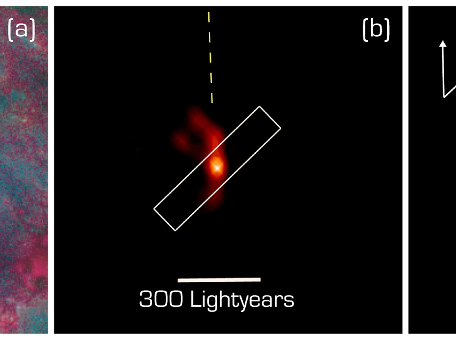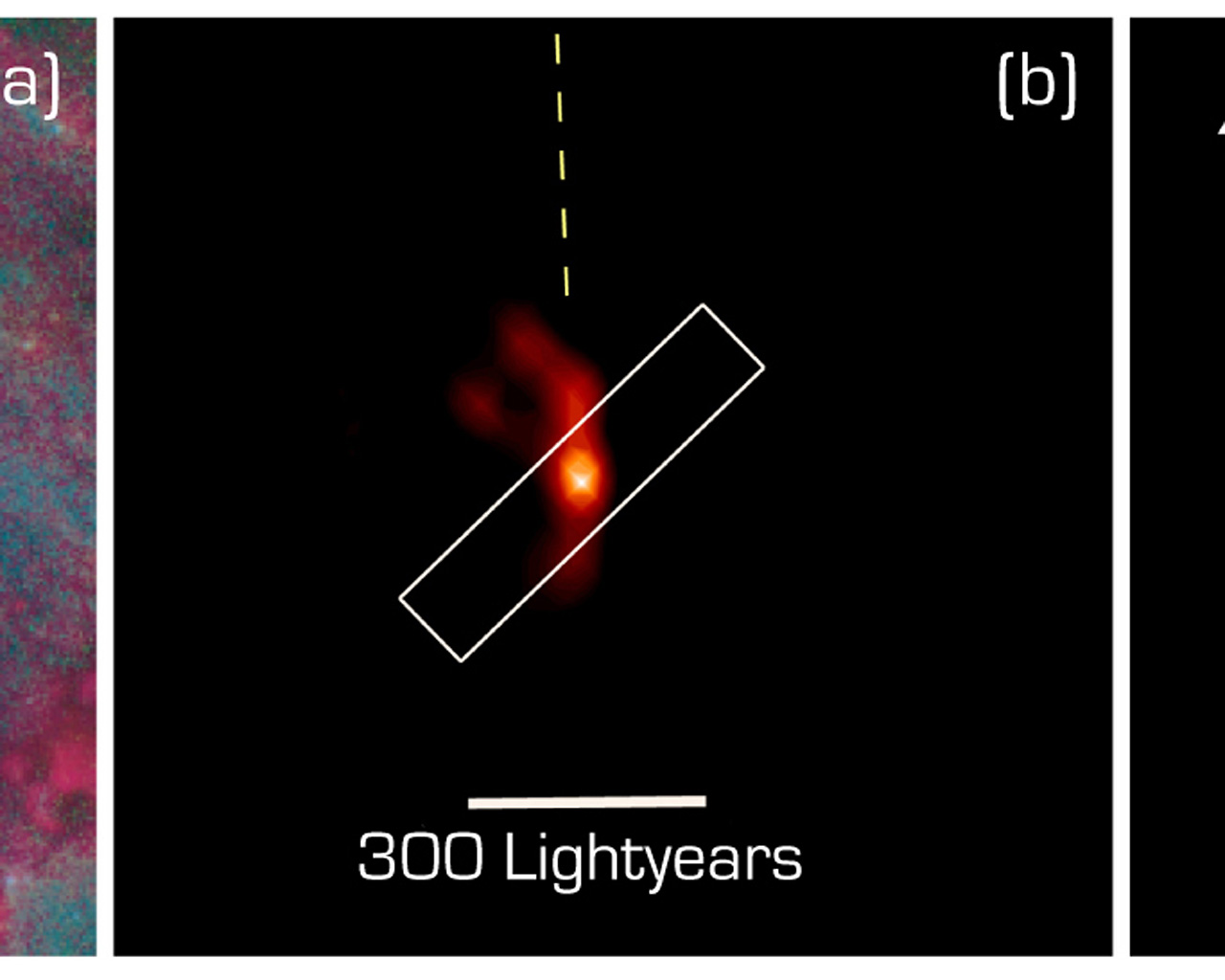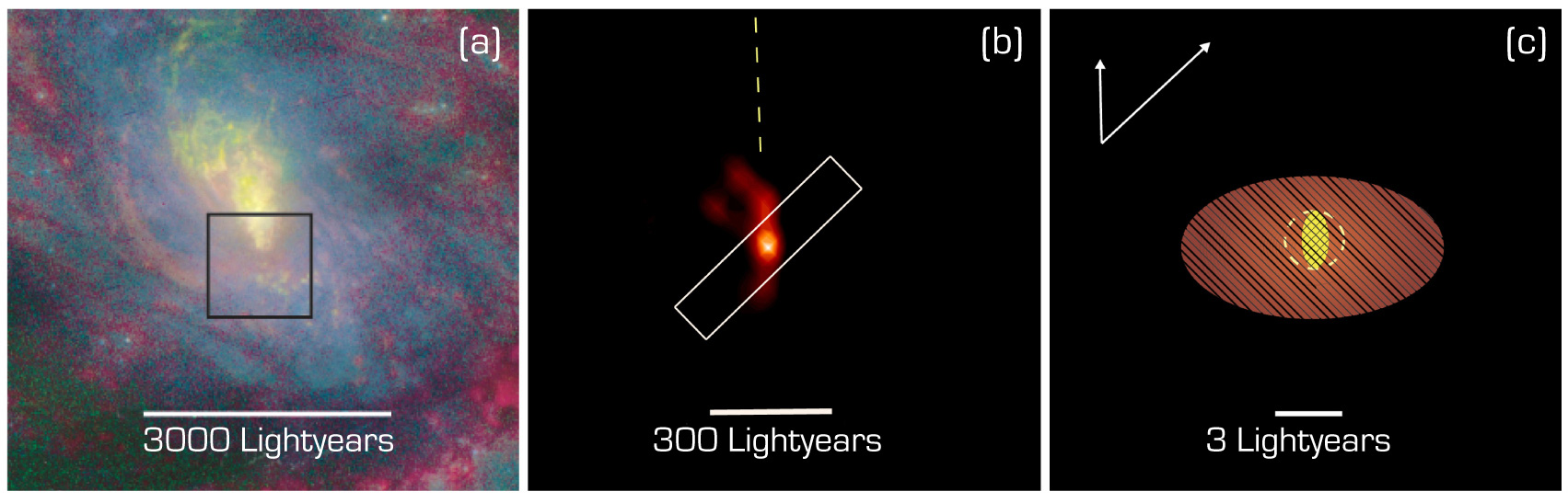New insight into the central region of the active galaxy NGC 1068, at increasing magnification. Image a (left) is a colour composite of NGC 1068, obtained with the Hubble Space Telescope (HST); showing stellar light in blue, oxygen ionized by the active nucleus in yellow, and inonized hydrogen in red. Image b (middle) is a VLTI image by MIDI at wavelength 8.7 µm, penetrating the dust cloud and showing the central structures in great detail. Image c (right) is a sketch of the dust structure of the innermost region. It contains a central hot component (at least 500°C; yellow), marginally resolved by the VLTI observations in the North-South direction (i.e. in the vertical direction in this image). It is surrounded by a larger warm component (~50°, red) that is well resolved. The arrows at the upper left indicate the directions of the two VLTI baselines and the corresponding resolution (image sharpness) at the central observed wavelength (10.5 µm).