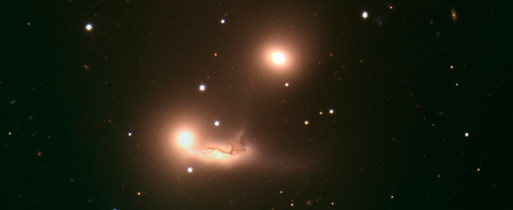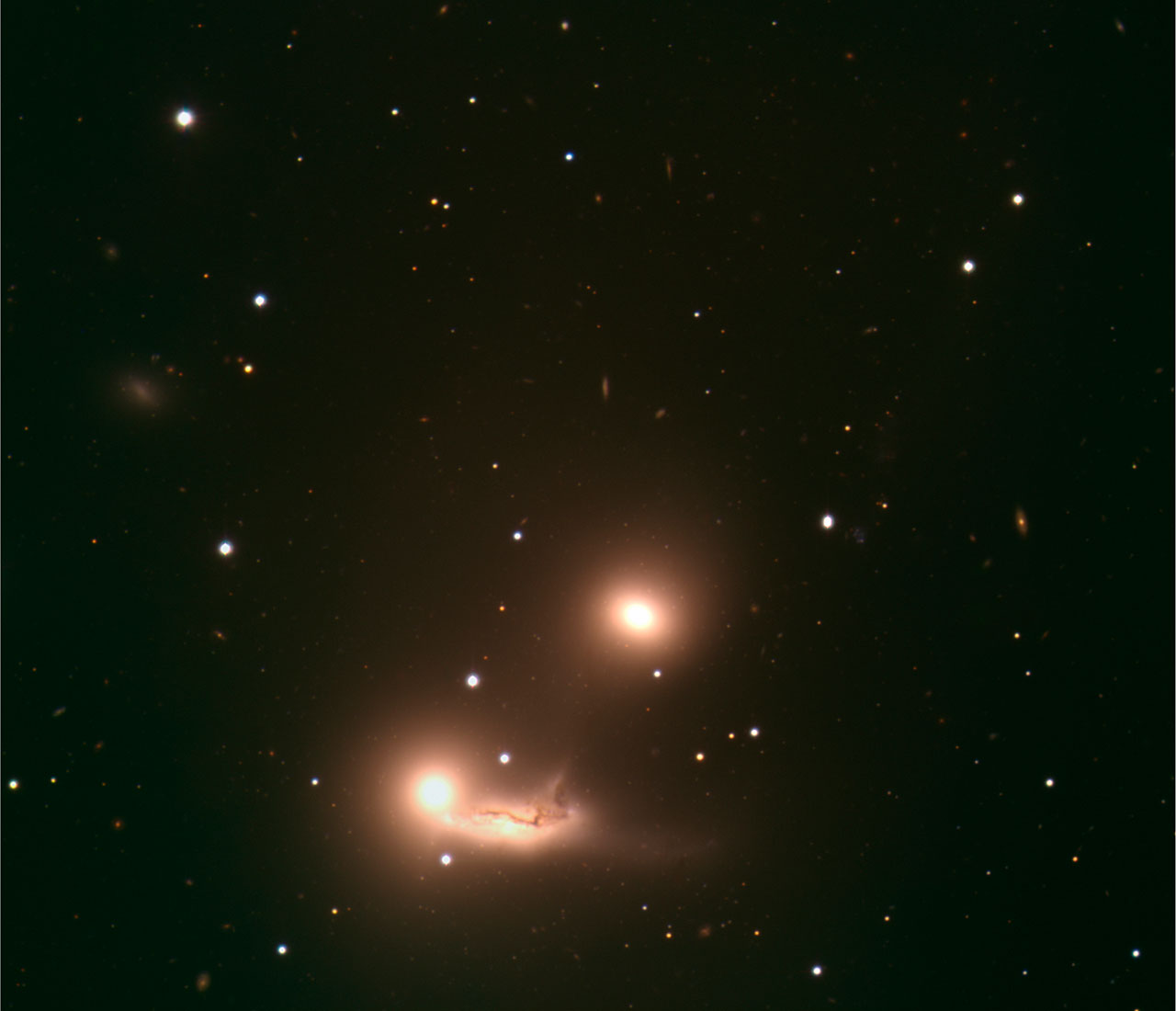 The pair is located roughly 70 million light-years away in the constellation Eridanus (The River). Billions of stars and dark dust are caught up in this beautiful gravitational swirl. The blue spiral arms with their many young stars and star-forming regions make a striking contrast with the yellow-reddish core of older stars.