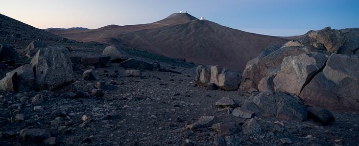 Paranal, the site of the VLT, was chosen for its unique characteristics: extreme dryness, very low cloud coverage, high altitude, and distant from any source of pollution. This wide-angle shot of the Atacama desert around Paranal, which shows the VLT and, in foreground, VISTA, summarizes it all. Photo taken in November 2007.