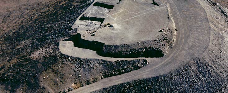 The summit of Paranal has been blasted away so to create the flat platform that supports the 4 Unit Telescopes, as well as the network of tunnels that transport the light from the telescopes to the interferometric laboratory. On this 1994 aerial view, the summit is ready: the platform is flattened, and the volume of the foundations is excavated. Note the white marks indicating the location of the interferometric tunnels.