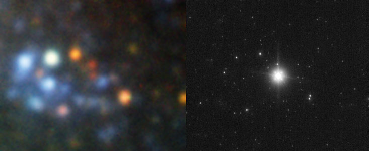 The image shows the star before it exploded (left), as observed with ISAAC and FORS on ESO's Very Large Telescope, and after the explosion (right), as seen by the very sharp NACO.