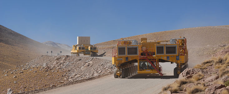 Heavyweights at 4,000 metre altitude: this photo shows the two ALMA antenna transporters during the final phase of the acceptance testing in April on the road between the ALMA OSF at 2,900 metre altitude and the AOS at 5,000 metres. The first transporter ("Otto") is travelling unloaded, while the second one ("Lore") is carrying the 115-tonne antenna dummy.