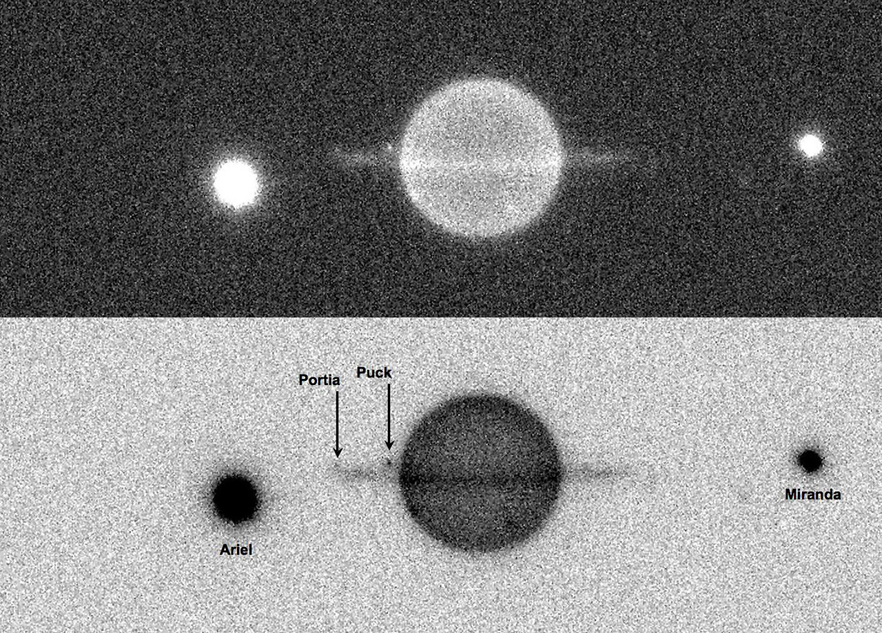 A movie of these observations is also available. The movie shows an animation of this system of satellites over a two hour period. You can easily see the impact of fluctuating seeing conditions on the image quality. Under good seeing, both small satellites Puck and Portia becomes clearly visible when they move along their orbital path, while the images start to blur when the seeing conditions degrade.