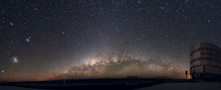 On the far left of the panorama, just left of the foreground antennas, is the elongated smudge of the Andromeda galaxy. This galaxy, more than ten times further away than the Magellanic Clouds, is our closest major neighbouring galaxy. It is also the largest galaxy in the Local Group — the group of about 30 galaxies which includes our own — and contains approximately one trillion stars, more than twice as many as the Milky Way. It is the only major galaxy visible with the naked eye. Even though only its most central region is apparent in this image, the galaxy spans the equivalent of six full Moons in the sky.
