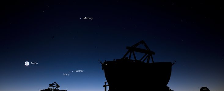 In the sky above the antennas, countless stars shine like distant jewels. Two other familiar celestial objects also stand out. First, the image is crowned by the Moon. Second, outshone by the glow of the Moon, it is possible to distinguish the Milky Way as a hazy stripe across the sky. Dark regions within the band are areas where the light from background stars is blocked by interstellar dust.