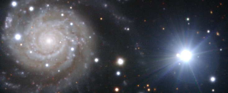 This image was taken with three of the 17 filters from the project: B (blue), V (green), and R (red). Data through an additional near-infrared filter was also used.
