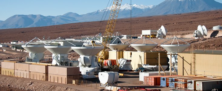 At 5000 metres altitude on the Chajnantor Plateau in the foothills of the Chilean Andes, in one of the most arid regions in the world, ALMA is guaranteed outstanding observing conditions. A high, dry site such as Chajnantor is needed because water vapour and oxygen in the Earth’s atmosphere strongly absorb the millimetre and submillimetre wavelengths of light at which ALMA is designed to observe.