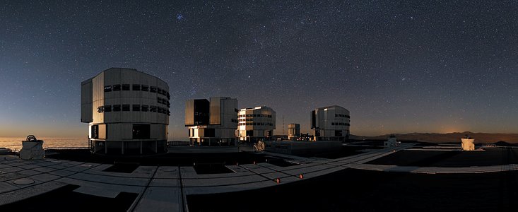 This panoramic photograph captures the ESO Very Large Telescope (VLT) against a beautiful twilight on Cerro Paranal. The enclosures of the VLT stand out in the picture as the telescopes in them are readied for a night of studying the Universe. The VLT is the world’s most powerful advanced optical telescope, consisting of four Unit Telescopes with primary mirrors 8.2 metres in diameter and four movable 1.8-metre Auxiliary Telescopes (ATs), which can be seen in the left corner of the image.