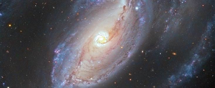 The outer spiral arms have a bluish colour, indicating the presence of hot, luminous, young stars, born out of clouds of interstellar gas. The central bulge and bar are yellower in appearance, due to the presence of older stars. Dark streaks can also be seen in places against the galaxy’s arms and central bulge, where lanes of cosmic dust block out some of the starlight.