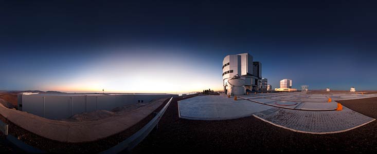 Imagine that you have just watched a beautiful sunset from the top of Cerro Paranal. As the Atacama Desert silently fades into the night, ESO’s Very Large Telescope (VLT) opens its powerful eyes on the Universe. With this spectacular 360-degree panorama, you can imagine the view that you would have if you were standing there, near the southern edge of the VLT’s platform.