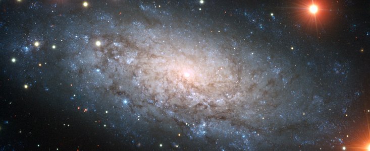 This image, from ESO’s Very Large Telescope (VLT), shows a truly remarkable galaxy known as NGC 3621. To begin with, it is a pure-disc galaxy. Like other spirals, it has a flat disc permeated by dark lanes of material and with prominent spiral arms where young stars are forming in clusters (the blue dots seen in the image). But while most spiral galaxies have a central bulge — a large group of old stars packed in a compact, spheroidal region — NGC 3621 doesn’t. In this image, it is clear that there is simply a brightening to the centre, but no actual bulge like the one in NGC 6744 (eso1118), for example.