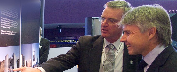 Today, 20 April 2009, was the opening of the European Week of Astronomy and Space Science (JENAM 2009), which takes place at the University of Hertfordshire, UK. Lord Drayson, the British Minister of State for Science and Innovation, addressed the many attendees to this conference, expressing the importance of astronomy and space science for today’s society. He also visited the ESO stand where he was introduced to ESO’s flagship astronomical facility, the Very Large Telescope, by Tim de Zeeuw, the ESO Director General, and Patrick Roche, UK member of the ESO Council. Tim de Zeeuw also explained about the European Extremely Large Telescope, a project which the minister showed great interest for.