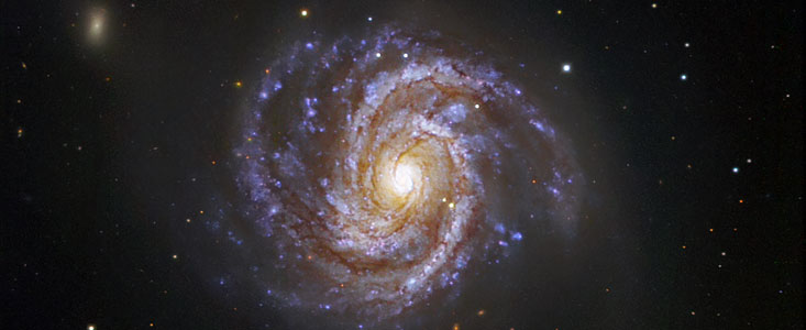 Similar in appearance to our own Milky Way, Messier 100 is a grand spiral galaxy that presents an intricate structure, with a bright core and two prominent arms. The galaxy harbours numerous young and hot massive stars as well as extremely hot regions of ionised hydrogen. Two smaller arms are seen emerging from the centre and reaching towards the larger spiral arms. The galaxy, located 60 million light-years away, is slightly larger than the Milky Way, with a diameter of about 120,000 light-years. A supernova was discovered in M100 on 4 February 2006. Named SN 2006X, it is the 5th supernova to have been found in M100 since 1900. This image is based on data acquired with the 1.5 m Danish telescope at the ESO La Silla Observatory in Chile, through three filters (B: 1390 s, V: 480 s, R: 245 s). The supernova is the brighter of the two stars seen just to the lower right of the galaxy centre.