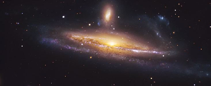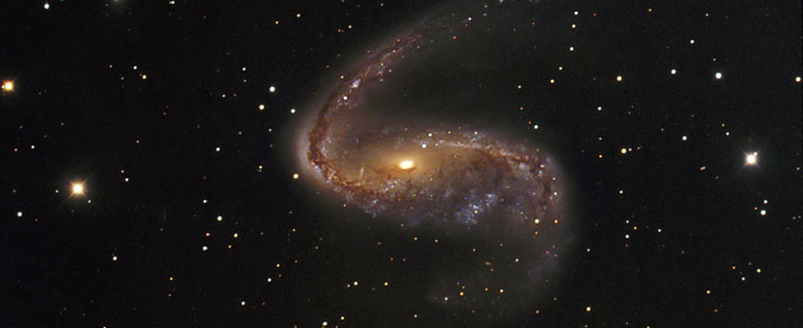 The pair is located roughly 70 million light-years away in the constellation Eridanus (The River). Billions of stars and dark dust are caught up in this beautiful gravitational swirl. The blue spiral arms with their many young stars and star-forming regions make a striking contrast with the yellow-reddish core of older stars.
