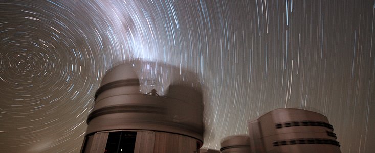 The rotating sky above ESO's Very Large Telescope at Paranal. This long exposure shows the stars rotating around the southern (left) and northern (right) celestial poles, the celestial equator being in the middle of the photo — where the stars seem to move in a straight line. The motion of the VLT's enclosures are also visible.