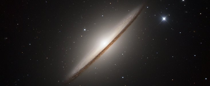 This luminous and massive galaxy has a total mass of about 800 billion suns, and is notable for its dominant nuclear bulge, composed mainly of mature stars, and its nearly edge-on disc composed of stars, gas, and dust. The complexity of this dust is apparent directly in front of the bright nucleus, but is also evident in the dark absorbing lanes throughout the disc. A large number of small, diffuse objects can be seen as a swarm in the halo of Messier 104. Most of these are globular clusters, similar to those found in our own Milky Way, but Messier 104 has a much larger number of them. This galaxy also appears to host a supermassive black hole of about 1 billion solar masses, one of the most massive black holes measured in any nearby galaxy, and 250 times larger than the black hole in the Milky Way. Despite having such a massive black hole at its centre, the galaxy is rather quiet, implying that the black hole is on a very stringent diet.
