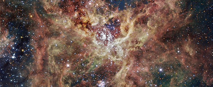 Located inside the Large Magellanic Cloud (LMC) – one of our closest galaxies – in what some describe as a frightening sight, the Tarantula nebula is worth looking at in detail. Also known as 30 Doradus or NGC 2070, the nebula owes its name to the arrangement of its bright patches that somewhat resemble the legs of a tarantula. Taking the name of one of the biggest spiders on Earth is very fitting in view of the gigantic proportions of this celestial nebula — it measures nearly 1,000 light years across ! Its proximity, the favourable inclination of the LMC, and the absence of intervening dust make this nebula one of the best laboratories to better understand the formation of massive stars. This spectacular nebula is energised by an exceptionally high concentration of massive stars, often referred to as super star clusters. This image is based on data acquired with the 1.5 m Danish telescope at the ESO La Silla Observatory in Chile, through three filters (B: 80 s, V: 60 s, R: 50 s).
