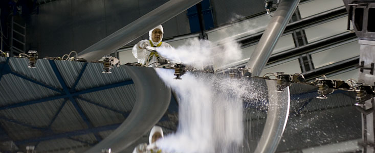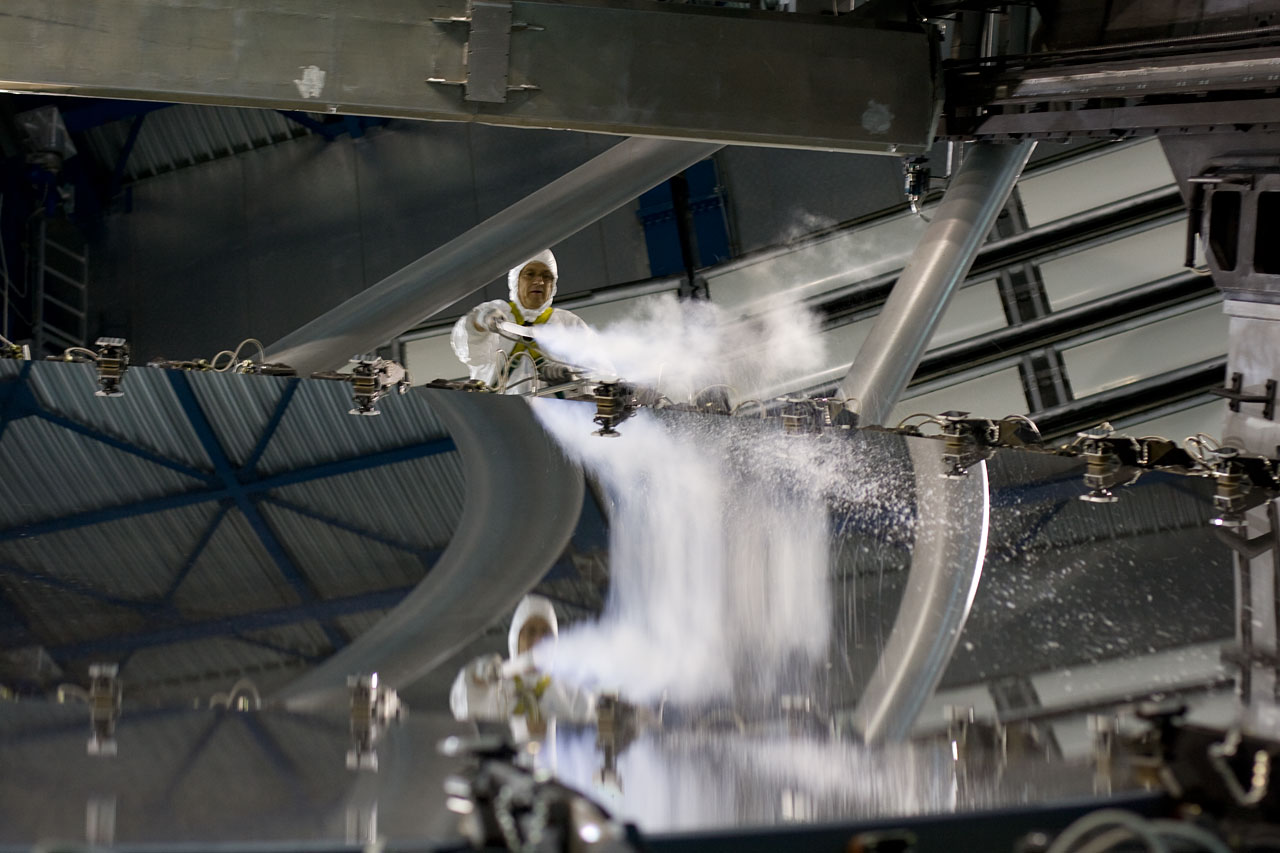 The mirror's surface is so delicate that normal cleaners used for household mirrors are not appropriate for telescopes. Observatories have developed other methods, such as this one using carbon dioxide snow. The tiny CO2 snowflakes in the white plume have a temperature of almost minus 80 degrees Celsius; when they land on the mirror, which is at room temperature, they cause minuscule 'explosions' that detach the dust grains from the surface. The dust then floats away, leaving the mirror clean. The process is nevertheless very delicate: should Alain Gilliotte, the optician performing the cleaning, let the CO2 device touch the mirror, the fragile reflective Aluminium coating would be scratched. Also, hair or cloth lint should stay away from the mirror, which is why the optician is wearing a white suit made of special plastic.
