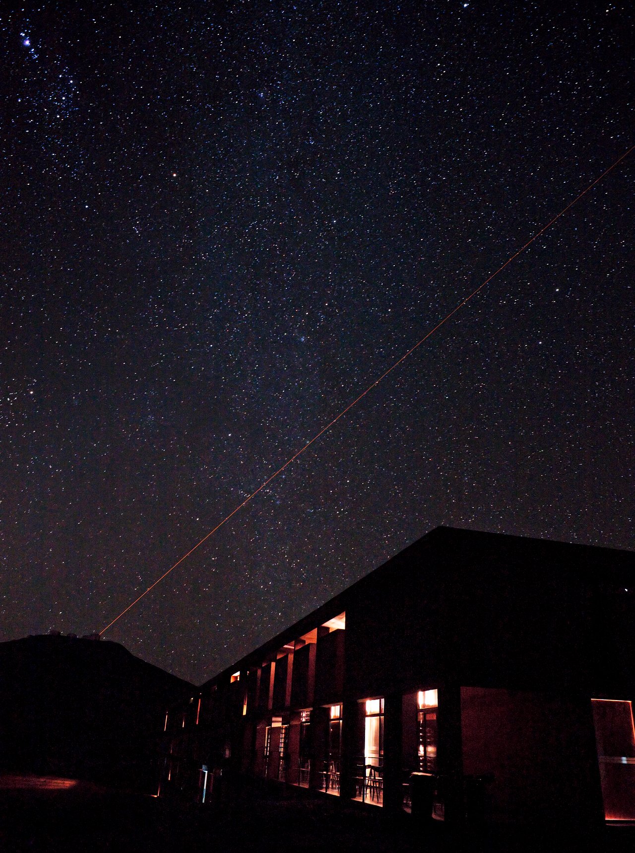 Night view of the Paranal Observatory, obtained on 21 March 2009. The Residencia — the place where staff can eat and sleep — is visible in the foreground, while one can distinguish the 8.2-metre Unit Telescopes of ESO’s Very Large Telescope in the higher background. Yepun, the Unit Telescope no. 4, is seen using the laser guide star to assist the adaptive optics instruments on the VLT. This allows astronomers to obtain images free from the blurring effect of the atmosphere, regardless of the brightness and location on the sky of the observed target. The image shows the great value of the dark night sky above Paranal. The band of the Milky Way is running through the image vertically. Orion and the Orion Nebula can be seen in the upper left corner along with a number of other interesting deep-sky objects in Auriga, the Charioteer. Tremendous efforts are being put into preventing light pollution from the Residencia and surrounding cities. Only long exposures with sensitive digital cameras are able to reveal the dim lights from the residencia rooms.