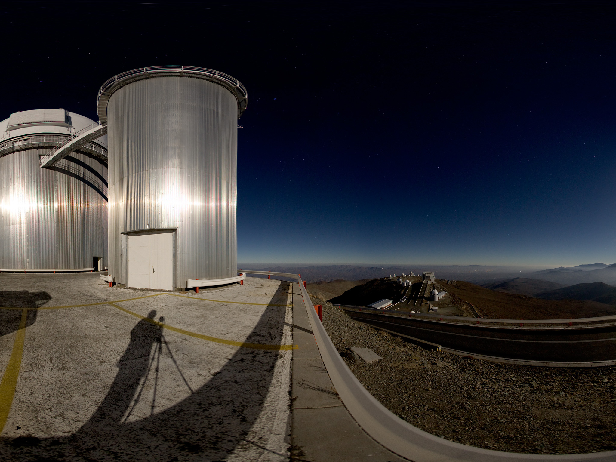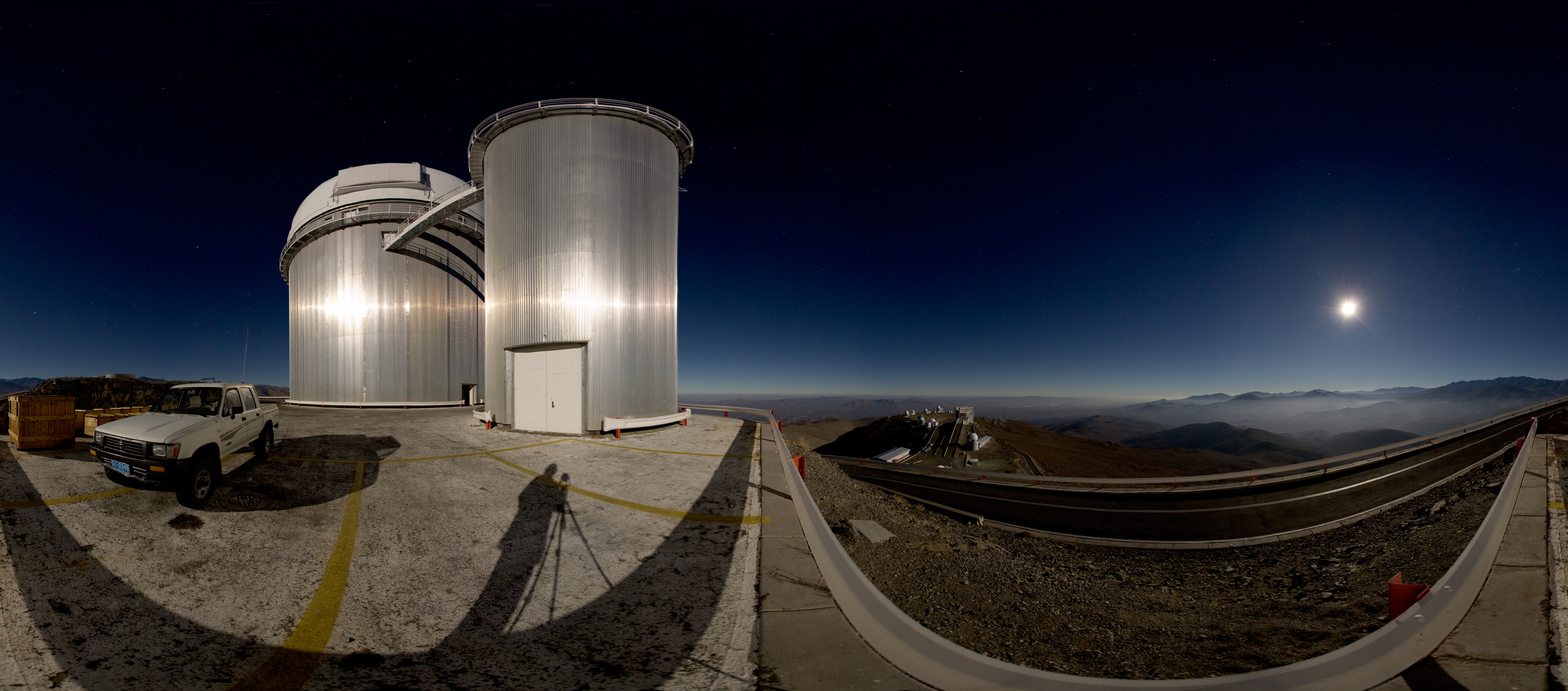 This panoramic image shows the La Silla observatory glistening under the cool glow of moonlight. Because the image wraps around almost a full 360 degrees, the angle of the lighting becomes downright surreal ; notice how the photographer’s shadow seems to stretch towards the Moon, and how the shiny ESO 3.6-metre telescope in the foreground appears to reflect light from a source located opposite the Moon. Fortunately, such optical trickery does not trouble La Silla’s fleet of telescopes, which reside at an altitude of 2,400 metres in the arid Chilean Atacama Desert. In fact, La Silla’s MPG/ESO 2.2-metre telescope has snapped some of astronomy’s iconic images with the Wide Field Imager (WFI) camera. Also at this observatory, the 3.58-metre New Technology Telescope (NTT) broke new ground for telescope engineering and design and was the first in the world to have a computer-controlled main mirror (active optics), a technology developed at ESO and now applied to most of the world's current large telescopes. A spectrograph called HARPS (High Accuracy Radial velocity Planet Searcher), mounted on the ESO 3.6-metre telescope, stands as the world’s foremost exoplanet hunter. La Silla, ESO’s first observatory, remains at the cutting-edge of astronomical discovery.