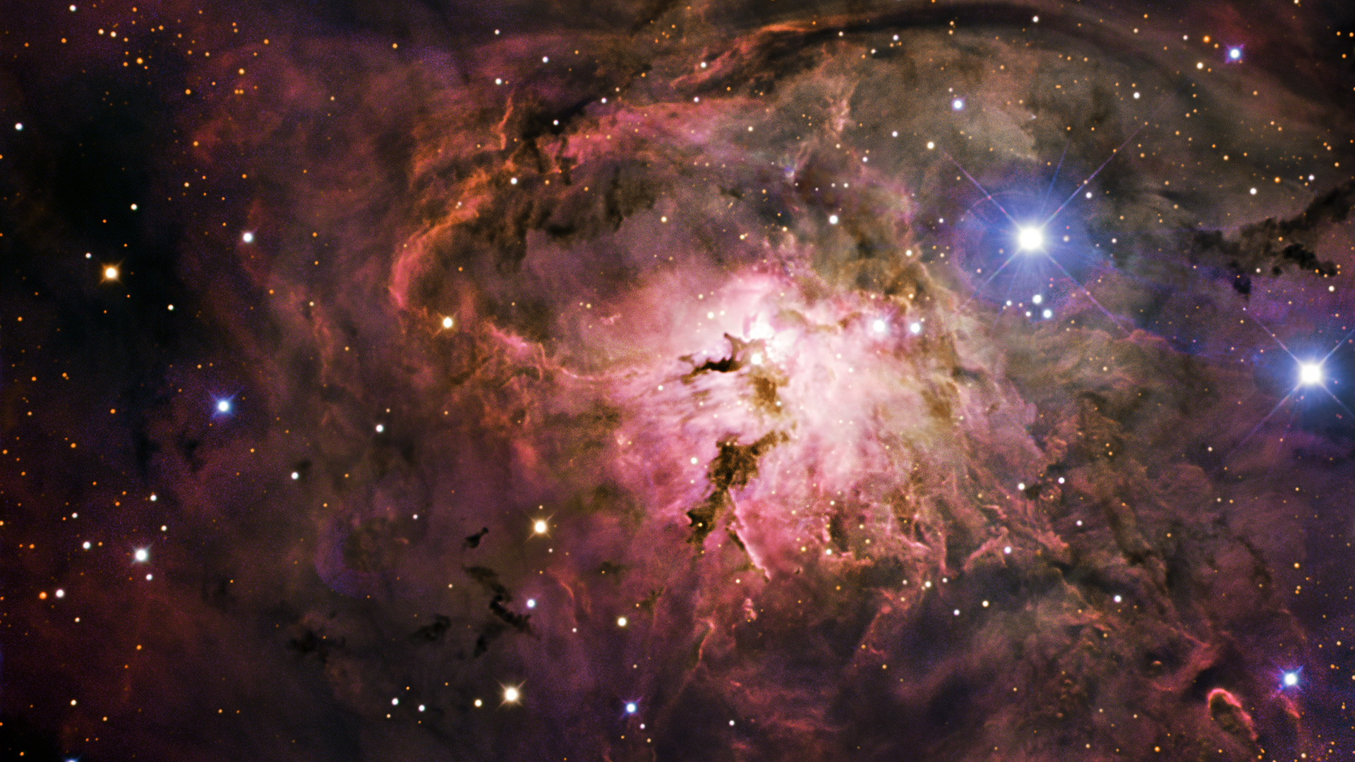 Gas and dust condense, beginning the process of creating new stars in this image of Messier 8, also known as the Lagoon Nebula. Located four to five thousand light-years away, in the constellation of Sagittarius (the Archer), the nebula is a giant interstellar cloud, one hundred light-years across. It boasts many large, hot stars, whose ultraviolet radiation sculpts the gas and dust into unusual shapes. Two of these giant stars illuminate the brightest part of the nebula, known as the Hourglass Nebula, a spiralling, funnel-like shape near its centre. Messier 8 is one of the few star-forming nebulae visible to the unaided eye, and was discovered as long ago as 1747, although the full range of colours wasn’t visible until the advent of more powerful telescopes. The Lagoon Nebula derives its name from the wide lagoon-shaped dark lane located in the middle of the nebula that divides it into two glowing sections.