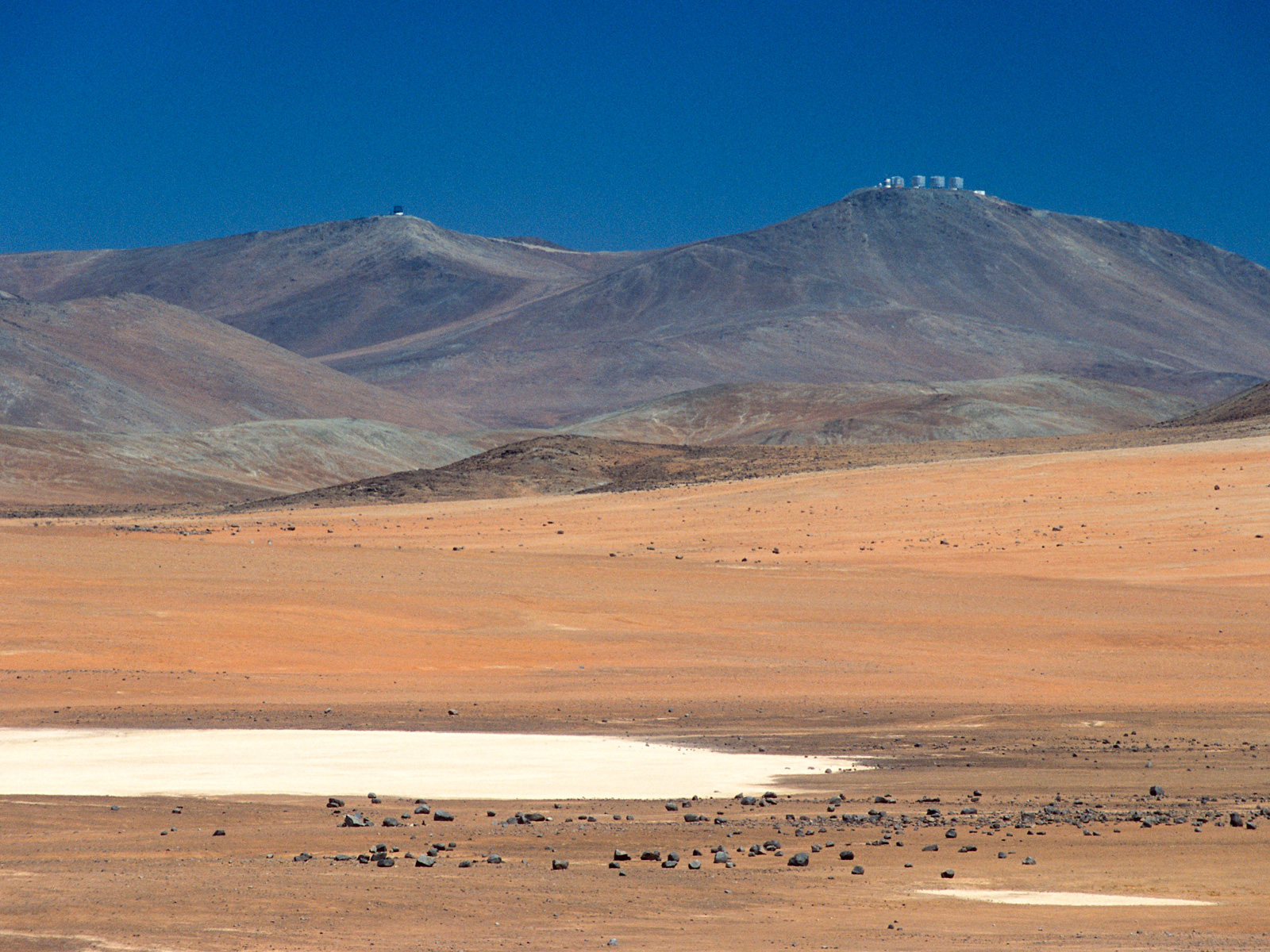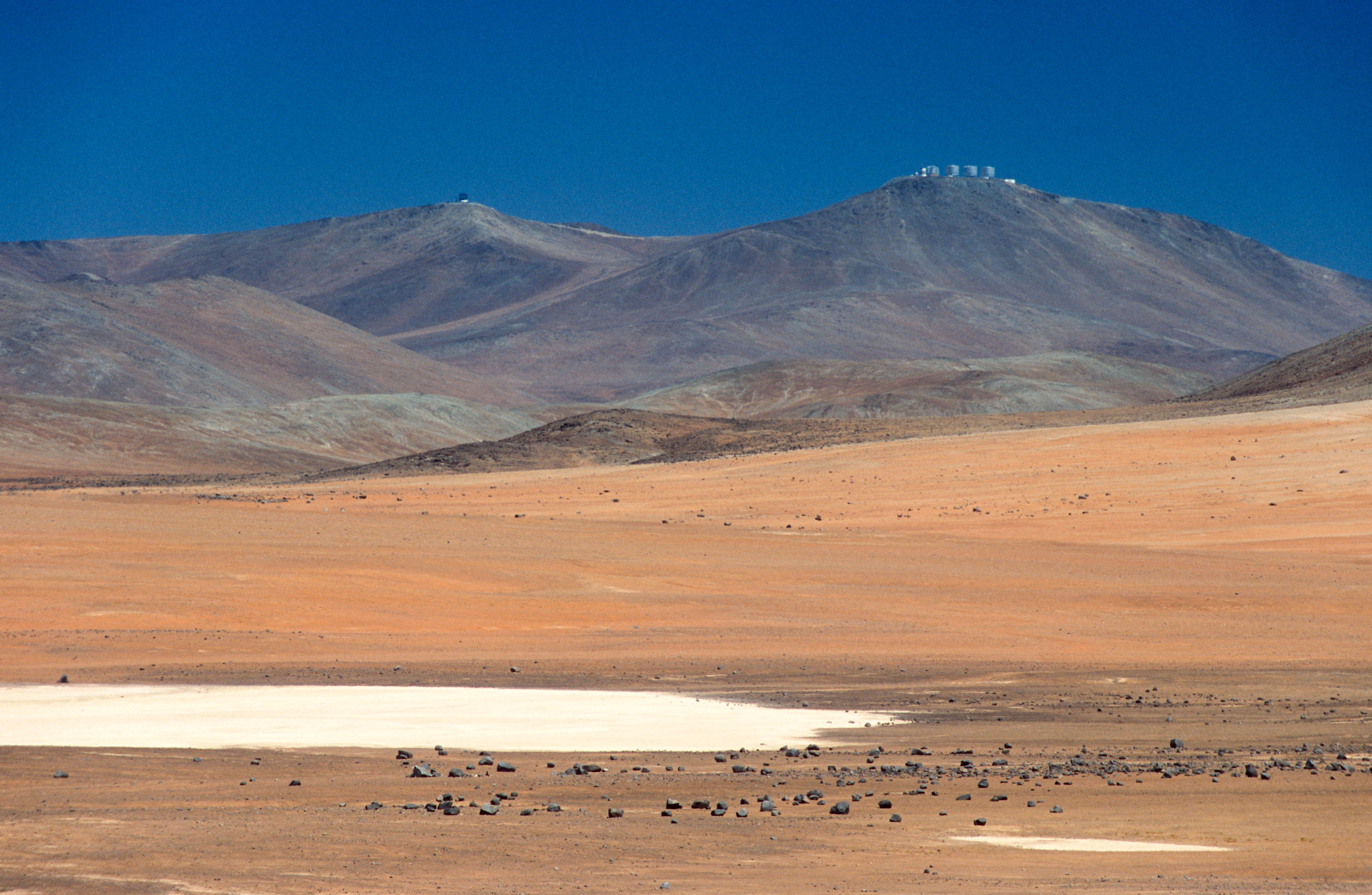This picture looks like a scene from a science fiction movie, with strange, distant structures rising over a desolate alien valley. In fact, this is the barren Atacama Desert in northern Chile, and the oddly shaped buildings silhouetted against the sky are part of ESO’s Very Large Telescope (VLT) observatory, the world’s most advanced ground-based observatory. The four 8.2-metre Unit Telescopes stand out to the right on the summit of Mount Paranal. To the left looms the new 4.1-metre Visible and Infrared Survey Telescope for Astronomy (VISTA), the largest survey telescope in operation.