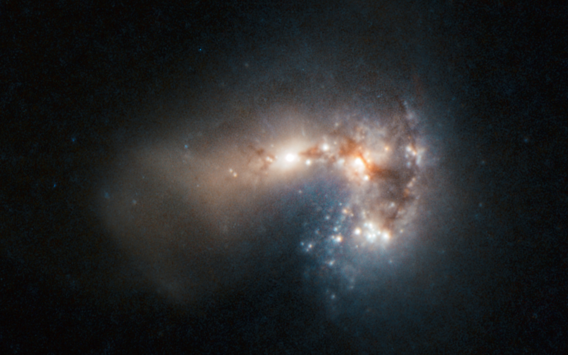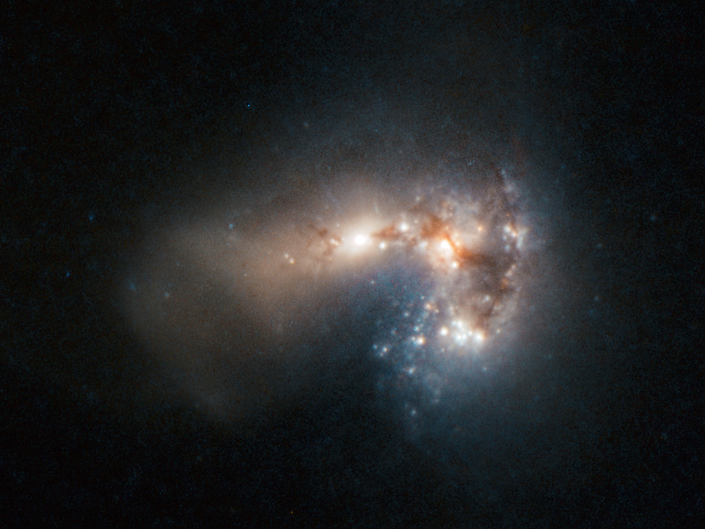 Haro 11 appears to shine gently amid clouds of gas and dust, but this placid facade belies the monumental rate of star formation occurring in this “starburst” galaxy. By combining data from ESO’s Very Large Telescope and the NASA/ESA Hubble Space Telescope, astronomers have created a new image of this incredibly bright and distant galaxy. The team of astronomers from Stockholm University, Sweden, and the Geneva Observatory, Switzerland, have identified 200 separate clusters of very young, massive stars. Most of these are less than 10 million years old. Many of the clusters are so bright in infrared light that astronomers suspect that the stars are still emerging from the cloudy cocoons where they were born. The observations have led the astronomers to conclude that Haro 11 is most likely the result of a merger between a galaxy rich in stars and a younger, gas-rich galaxy. Haro 11 is found to produce stars at a frantic rate, converting about 20 solar masses of gas into stars every year.