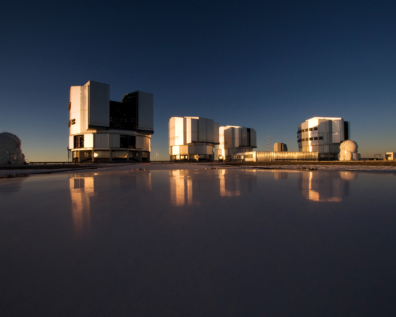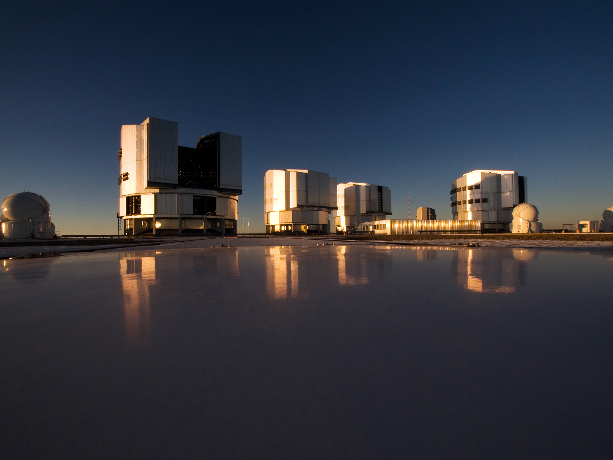 The Sun sets at ESO’s Very Large Telescope (VLT) in this image. Taken at the observatory on Cerro Paranal in the dry Atacama Desert of Chile, the observatory’s four 8.2-metre telescopes can be seen preparing for the night ahead. Three of the VLT’s four Auxiliary 1.8-metre Telescopes (AT), used for interferometry, are also visible. The telescopes are seen reflected in the protection cover of one of the AT stations. The ATs are mounted on tracks and can be moved between precisely defined observing positions from where the beams of collected light are combined in the interferometric laboratory. The ATs are very unusual telescopes, as they are self-contained in their own ultra-compact protective domes, and travel with their own electronics, ventilation, hydraulics and cooling systems. Each AT has a transporter that lifts the telescope and moves it from one position to the other. At 2600 metres above sea level, the observing climate is excellent, with little disturbance from clouds.