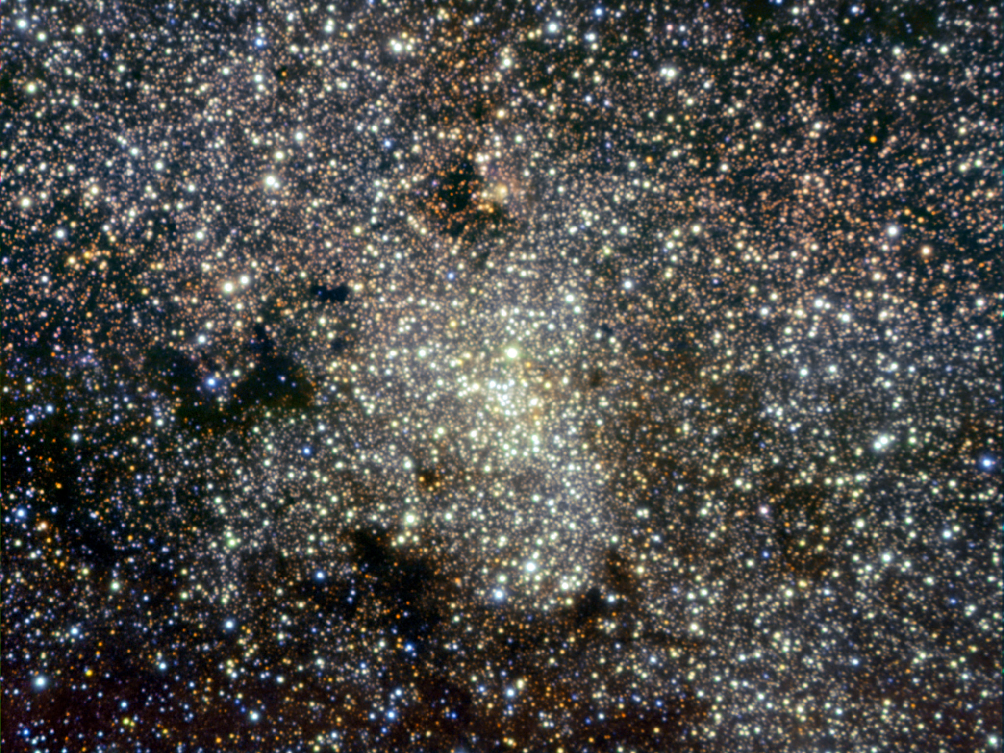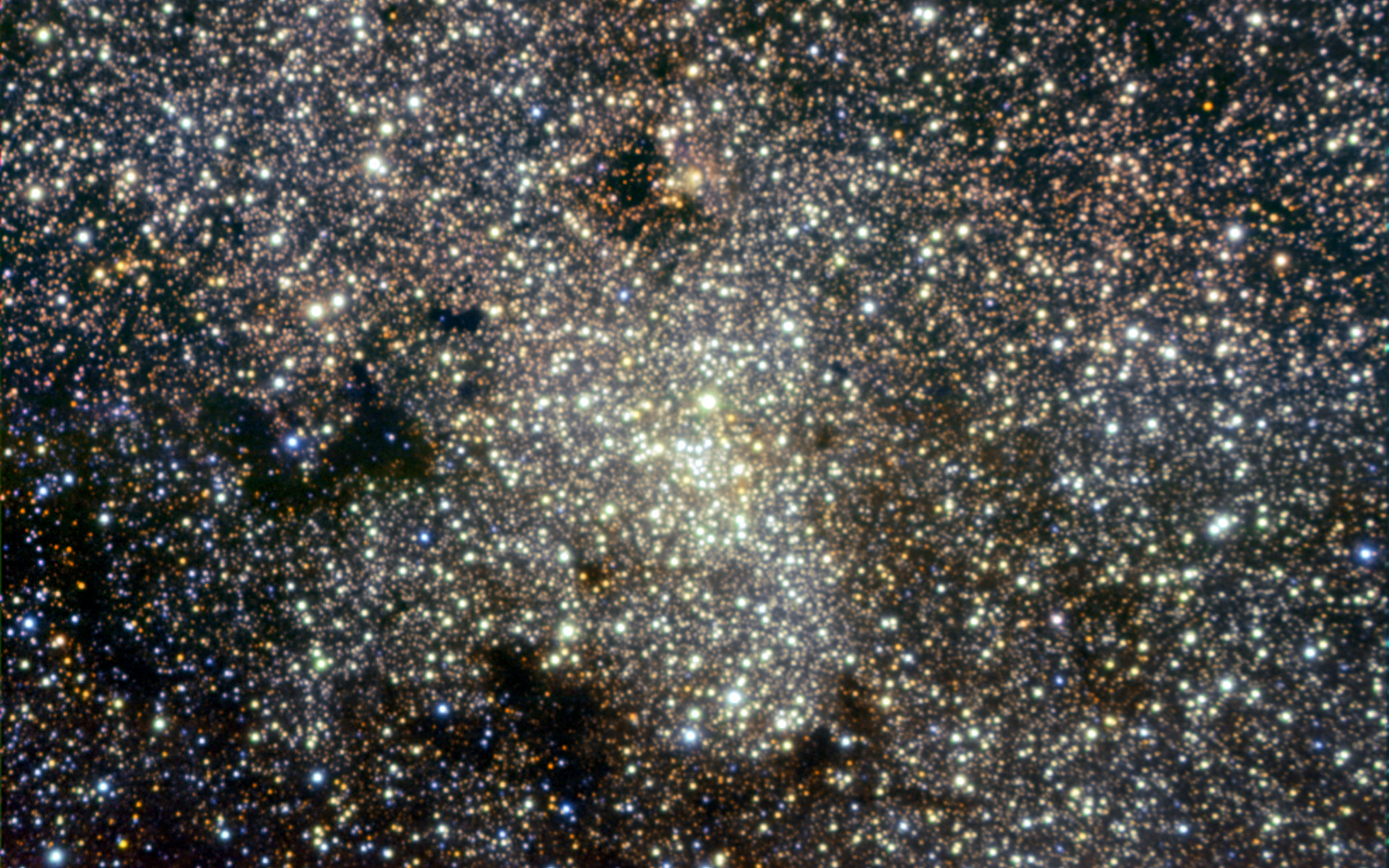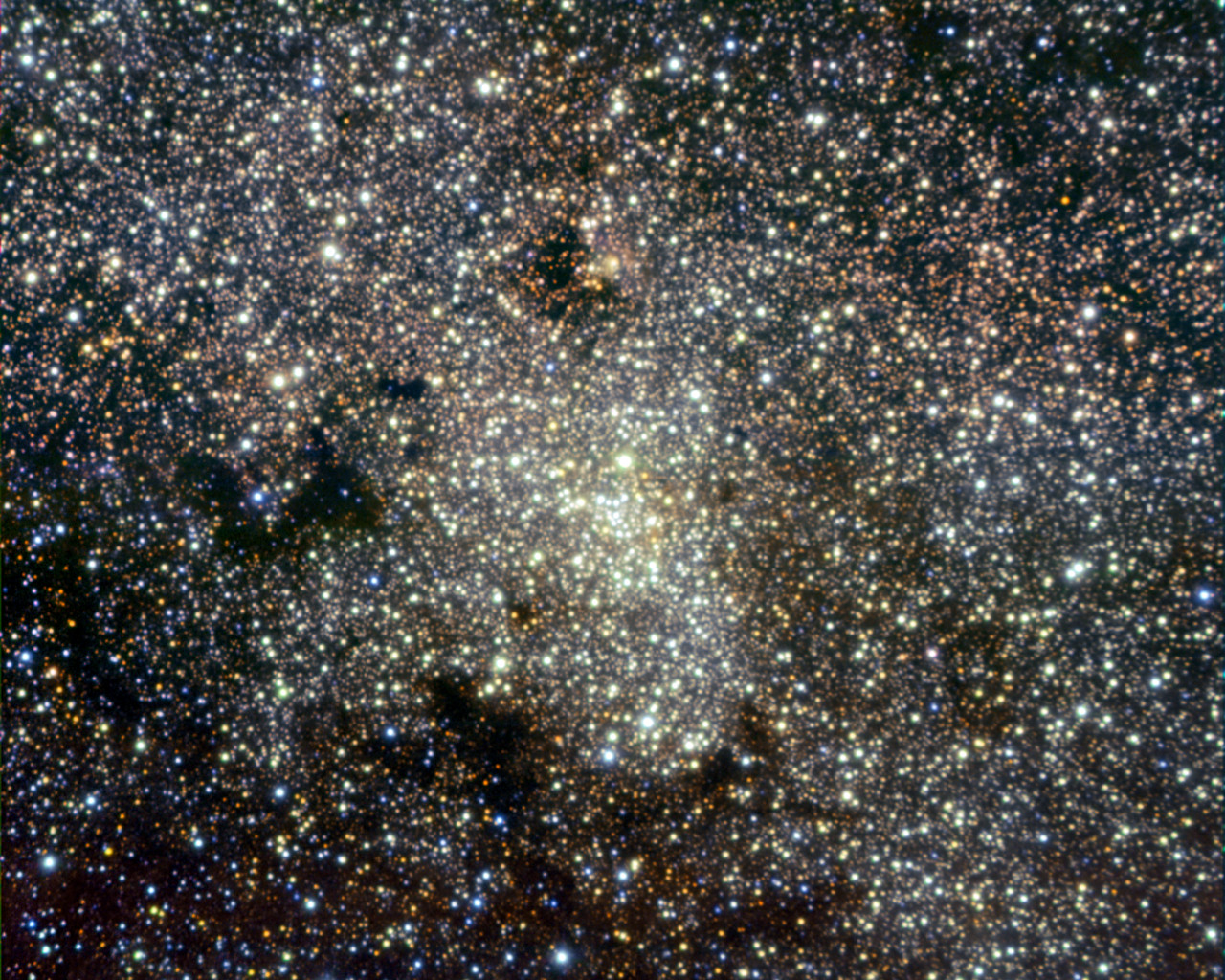 From Chile’s Atacama Desert, site of the ESO observatories, the Milky Way offers magnificent views, particularly in the southern hemisphere winter, when the central region of our galaxy is most visible (see eso0934). However, the Galactic Centre itself, located about 27 000 light-years away in the constellation of Sagittarius, hides behind thick clouds of interstellar dust, which appear as dark obscuring lanes in visible light, but which are transparent at longer wavelengths such as the infrared. In this image, the infrared observations clearly reveal the dense clustering of stars in the galactic core.
