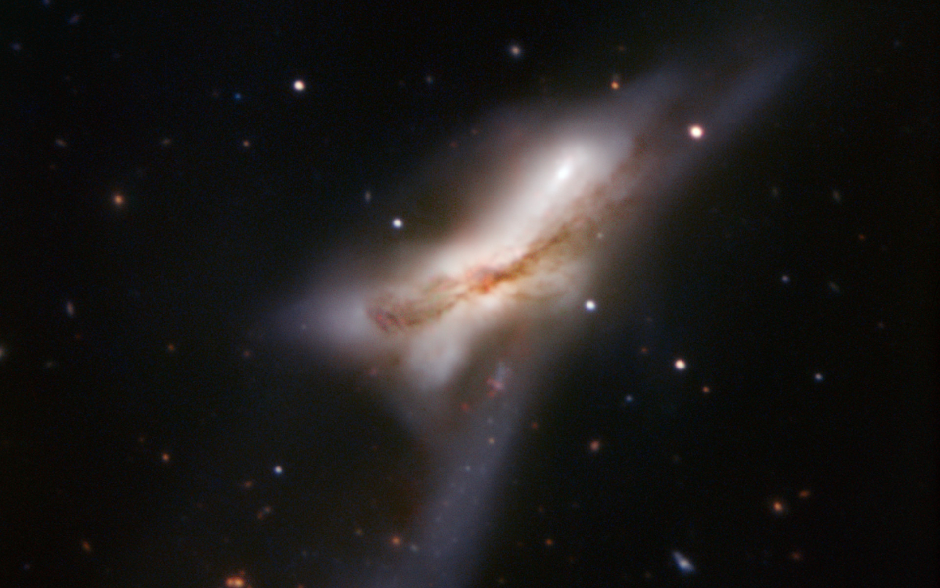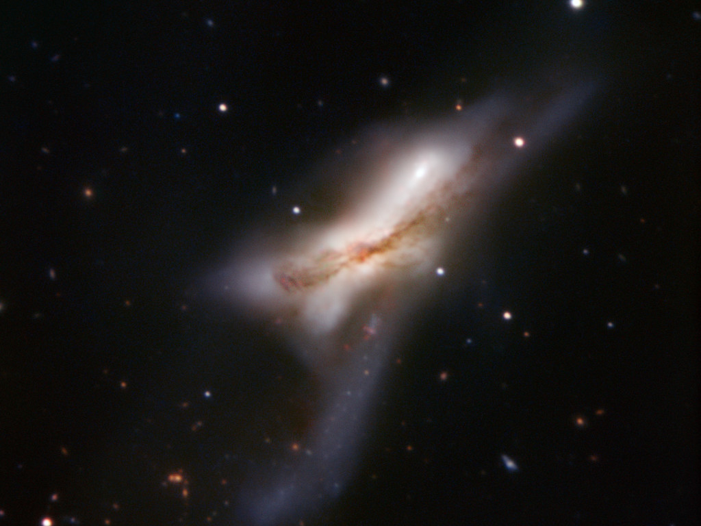 NGC 520 — also known as Arp 157 — looks like a galaxy in the midst of exploding. In reality, it’s the exact opposite. Two enormous spiral galaxies are crashing into each other, melding and forming a new conglomerate. This happens slowly, over millions of years — the whole process started some 300 million years ago. The object, about 100 000 light-years across, is now in the middle stage of the merging process, as the two nuclei haven’t merged yet, but the two discs have. The merger features a tail of stars and a prominent dust lane. NGC 520 is one of the brightest interacting galaxies in the sky and lies in the direction of Pisces (the Fish), approximately 100 million light-years from Earth.