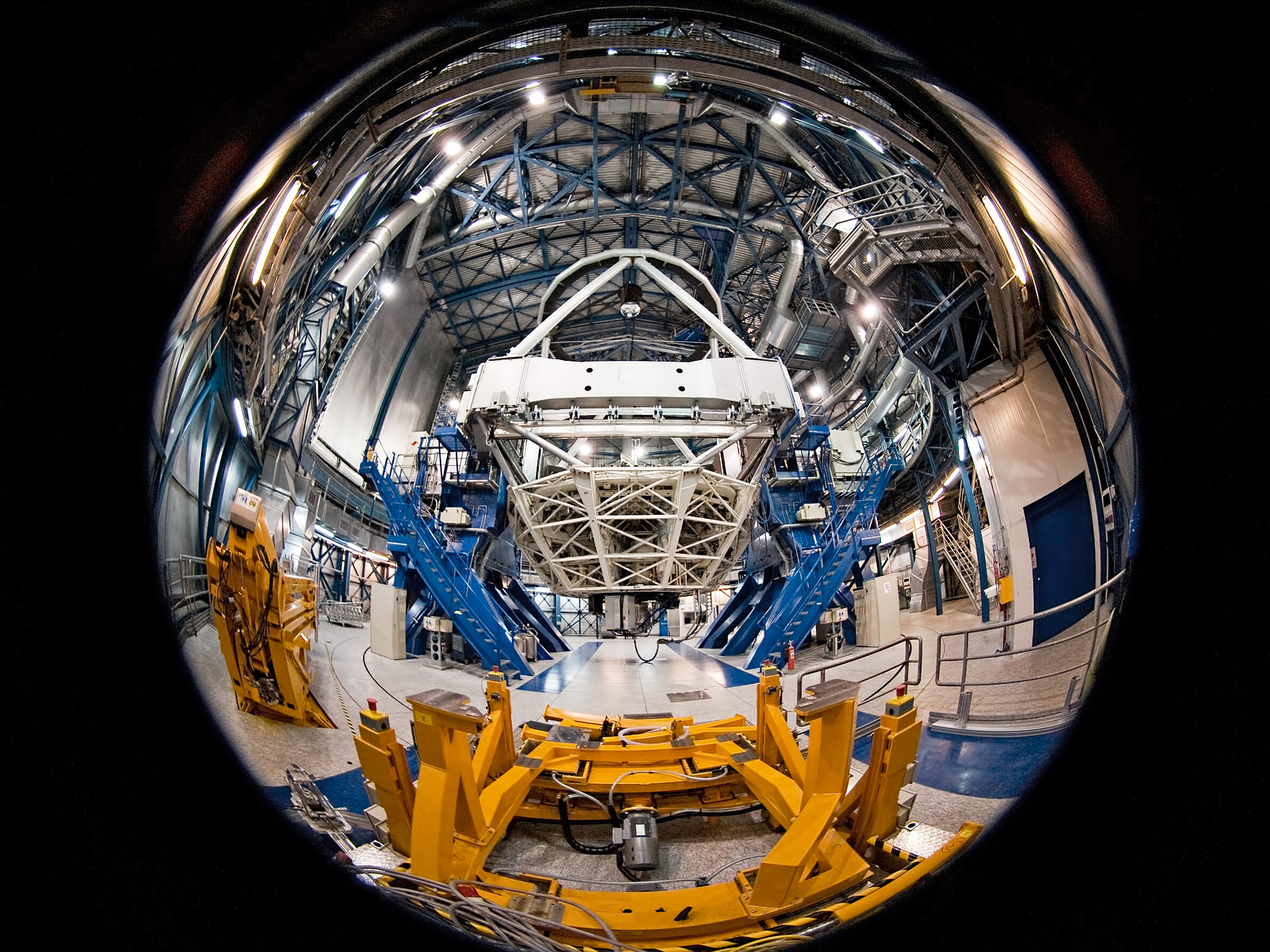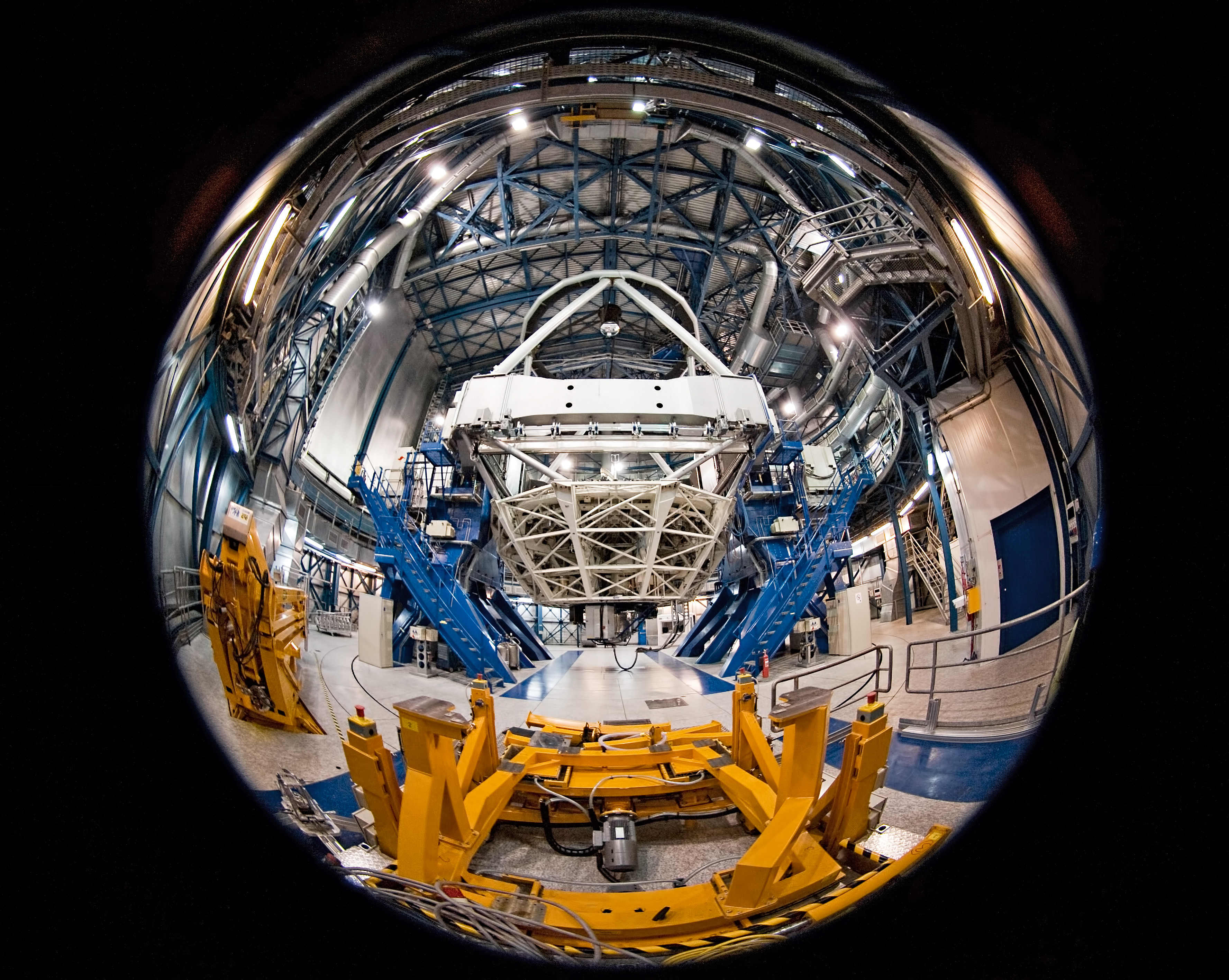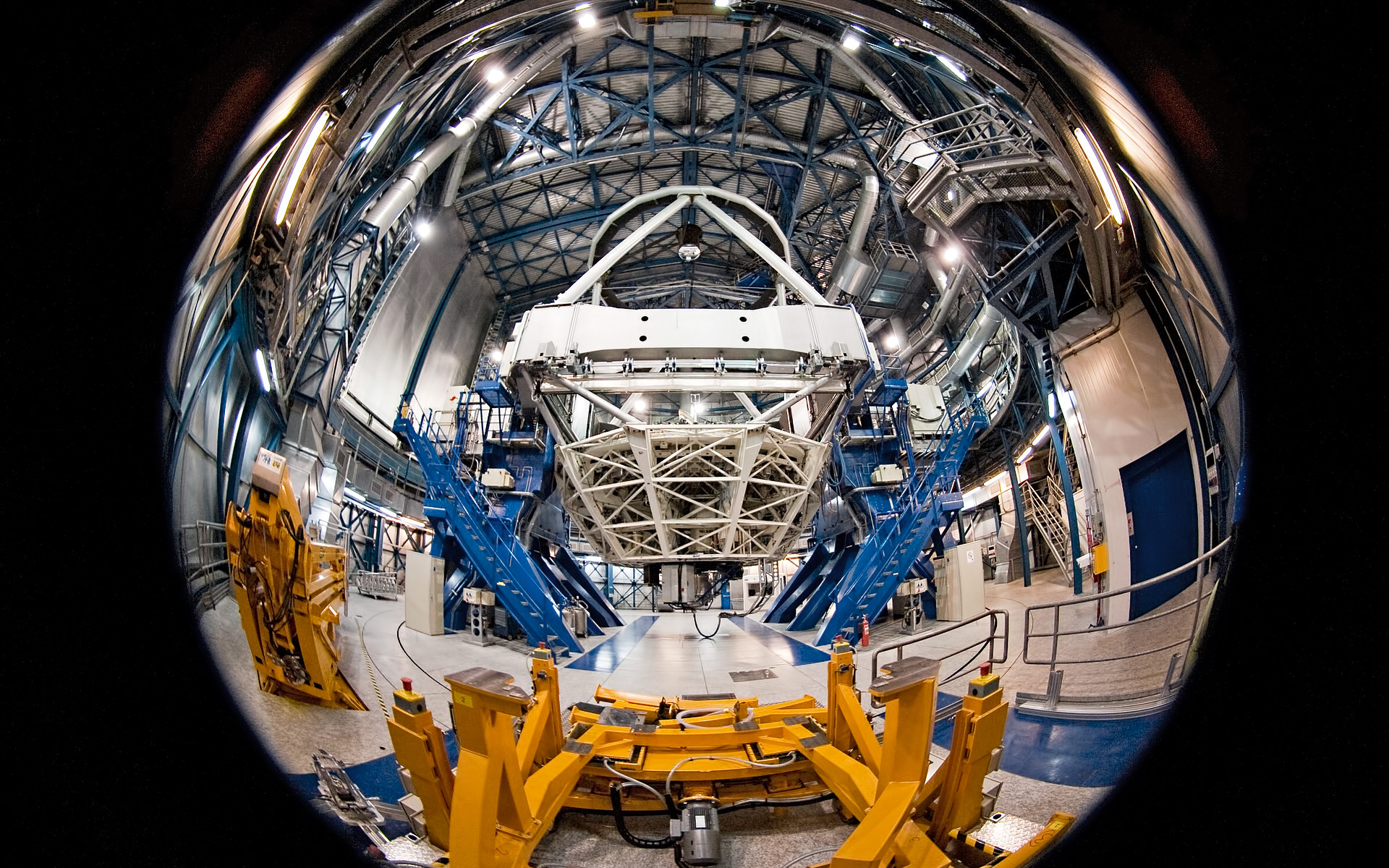 Imagine being a fly on the wall of ESO's Very Large Telescope (VLT) at the world's most advanced optical observatory. You could have a view a little like this. Fisheye photography gives this unusual view of the 8.2-metre diameter telescope, poised and ready to begin gathering light from the deep recesses of the Universe as soon as the dome opens and starlight pours in.