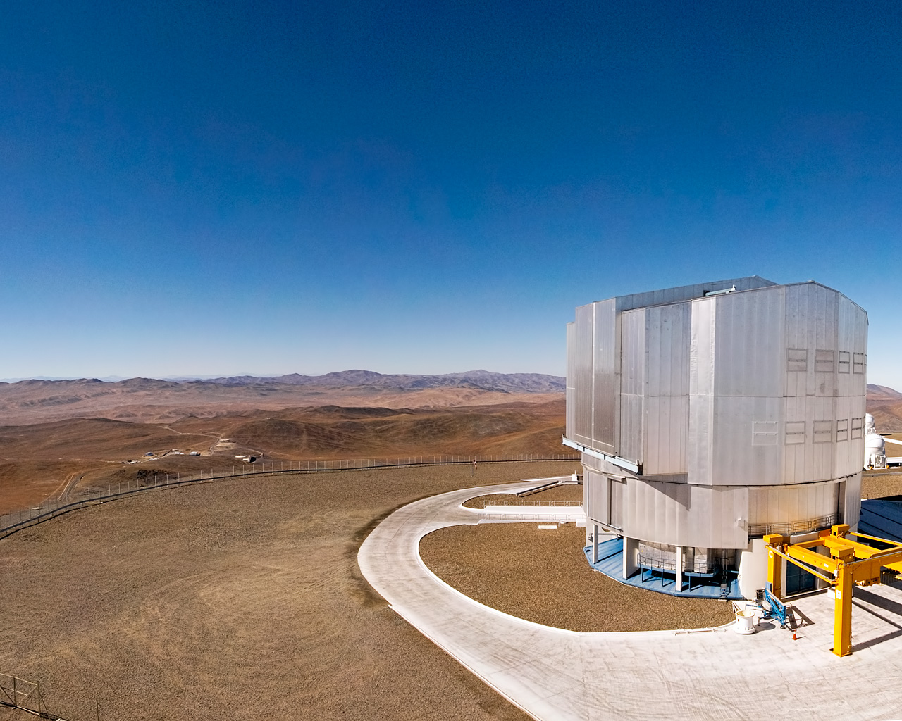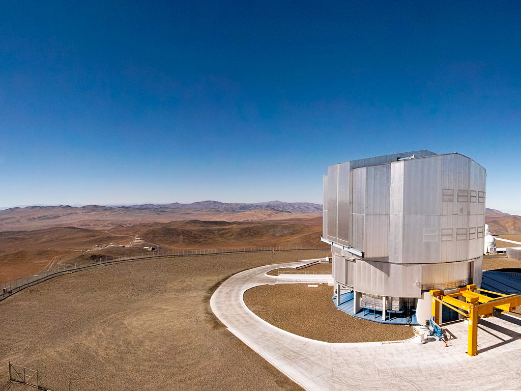 Atop Cerro Paranal is the ESO Very Large Telescope (VLT), the world’s most advanced optical and near infrared ground-based astronomical facility, composed of four 8.2-metre Unit Telescopes (UTs) and four 1.8-metre Auxiliary Telescopes (ATs). The fourth Unit Telescope (UT4), named Yepun in the Mapuche language, is most prominent in this photograph, while UT3 (Melipal) and UT1 (Antu) are just visible on the right-hand edge of the picture. Three of the smaller ATs can also be seen on the 200-metre-wide observing platform. The yellow structure in front of Yepun is the “M1 Lifting Platform”, used to move the 8.2-metre-diameter primary mirror (M1) and its support structure out of the telescope building for periodic recoating.