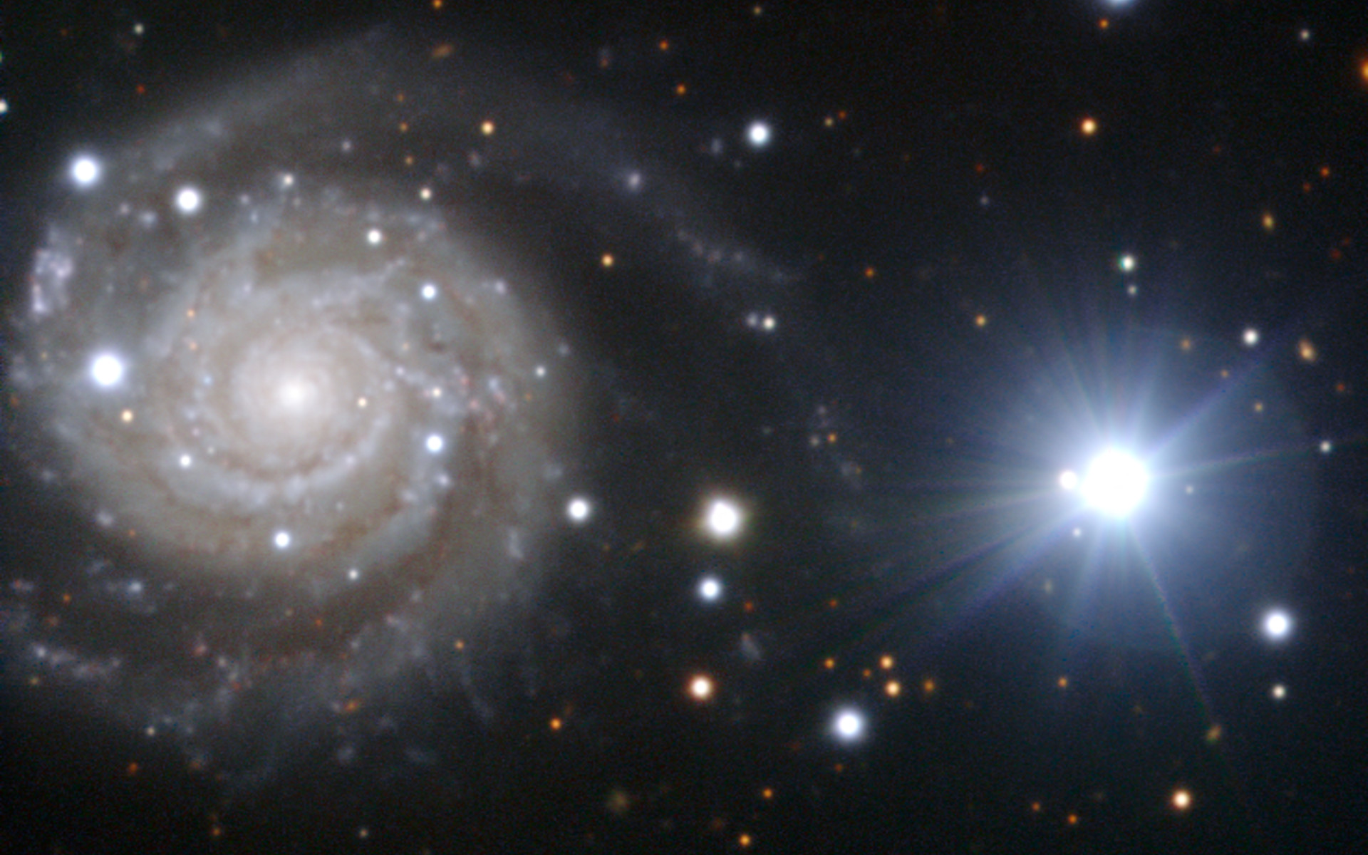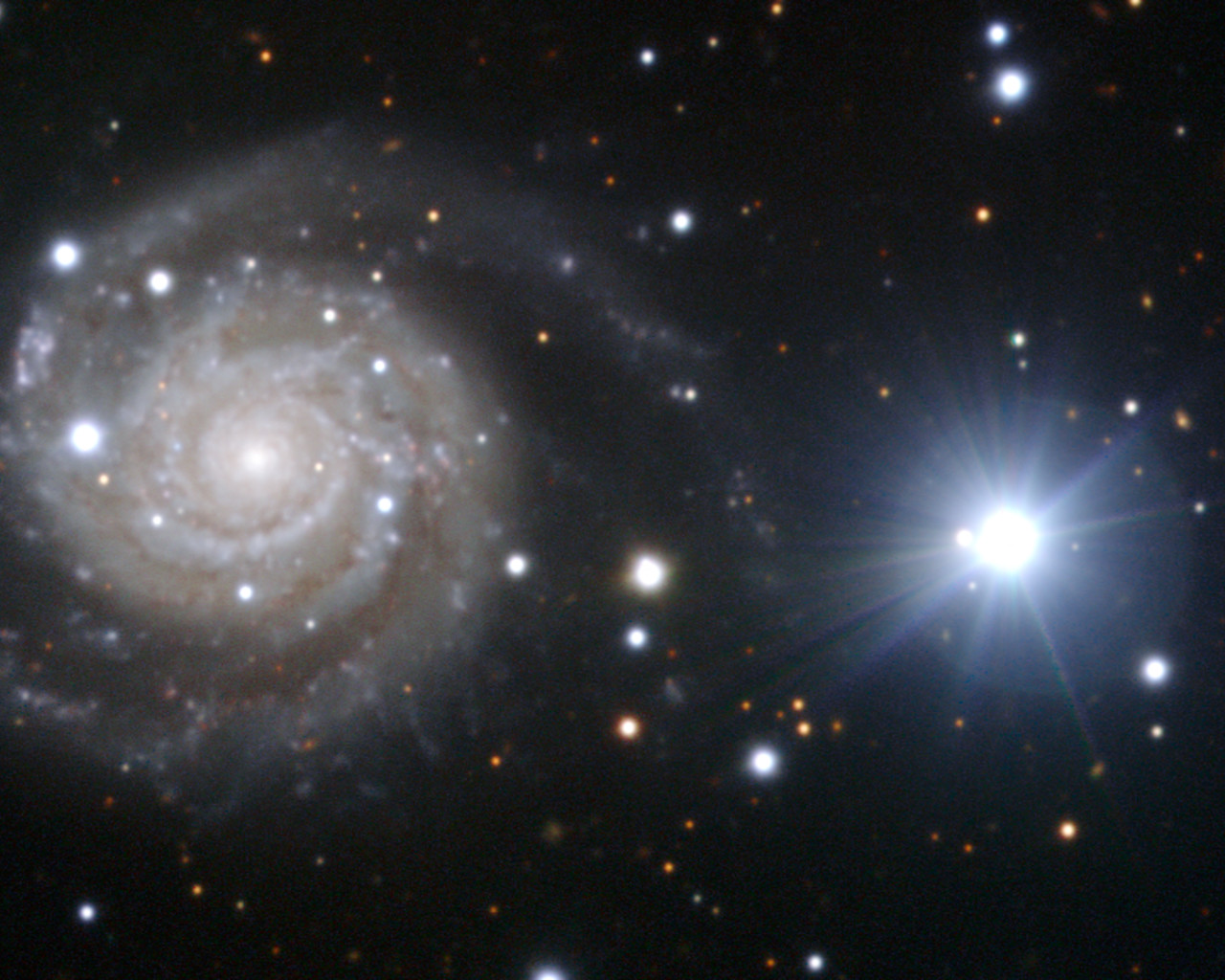 This galaxy has attracted considerable interest from astronomers over the past nine months, thanks to the violent death of one of its stars, which was discovered on 27 June 2010. This supernova explosion, now known as Supernova 2010ev (SN 2010ev), is still visible as the — now faint — blue dot nestled within one of the thick spiral arms just to the left of the galaxy’s nucleus.