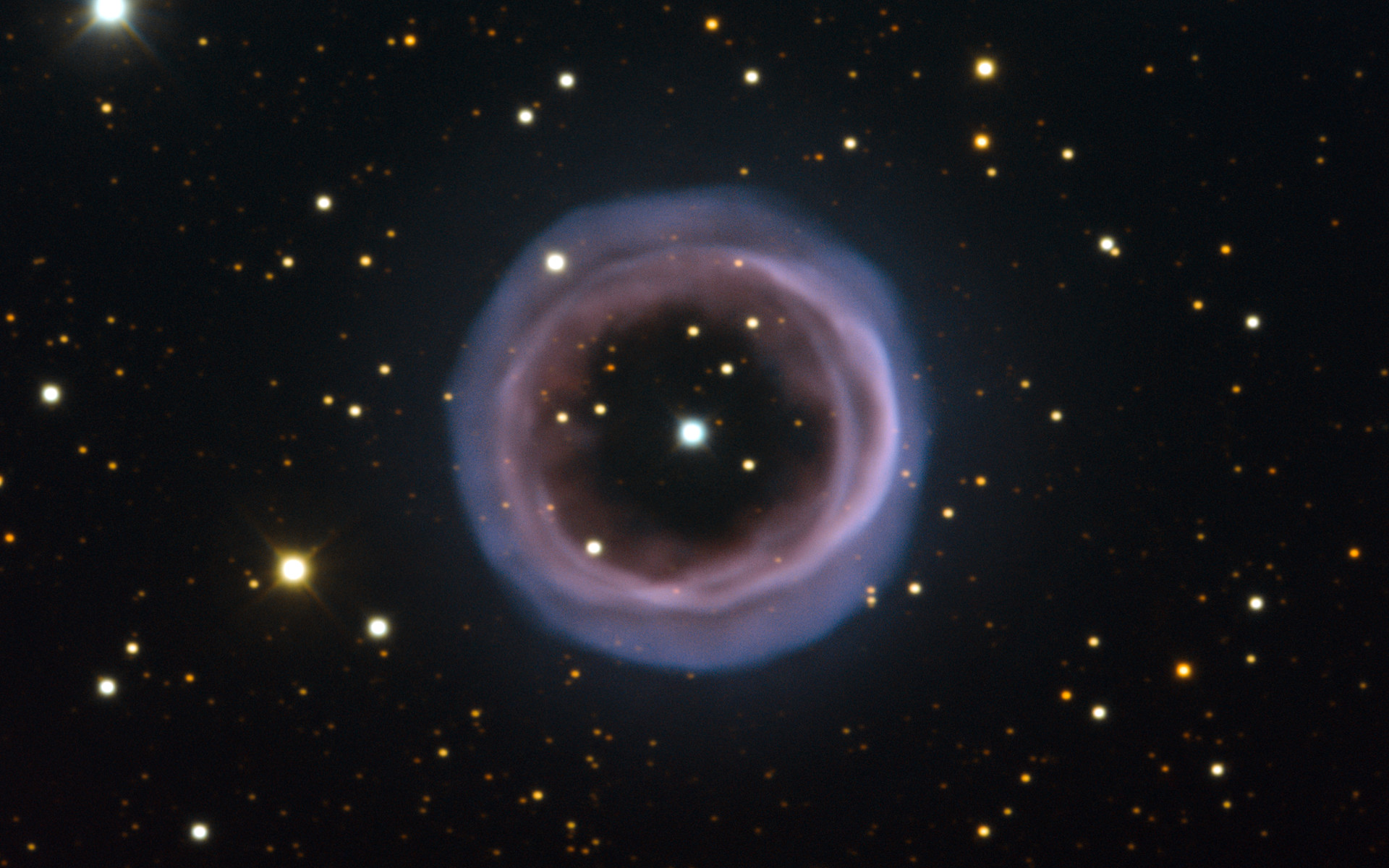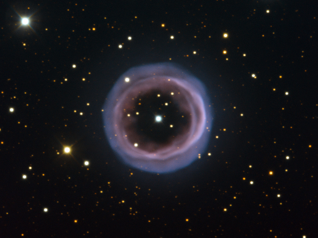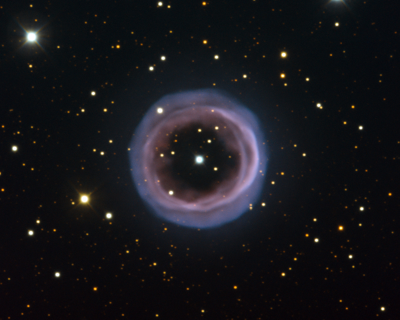 But the Fine Ring Nebula — captured here by the ESO Faint Object Spectrograph and Camera mounted on the New Technology Telescope at the La Silla Observatory in Chile — looks like an almost perfect circular ring. Astronomers believe that some of these more unusually shaped planetary nebulae are formed when the progenitor star is actually a binary system. The interaction between the primary star and its orbiting companion shapes the ejected material.