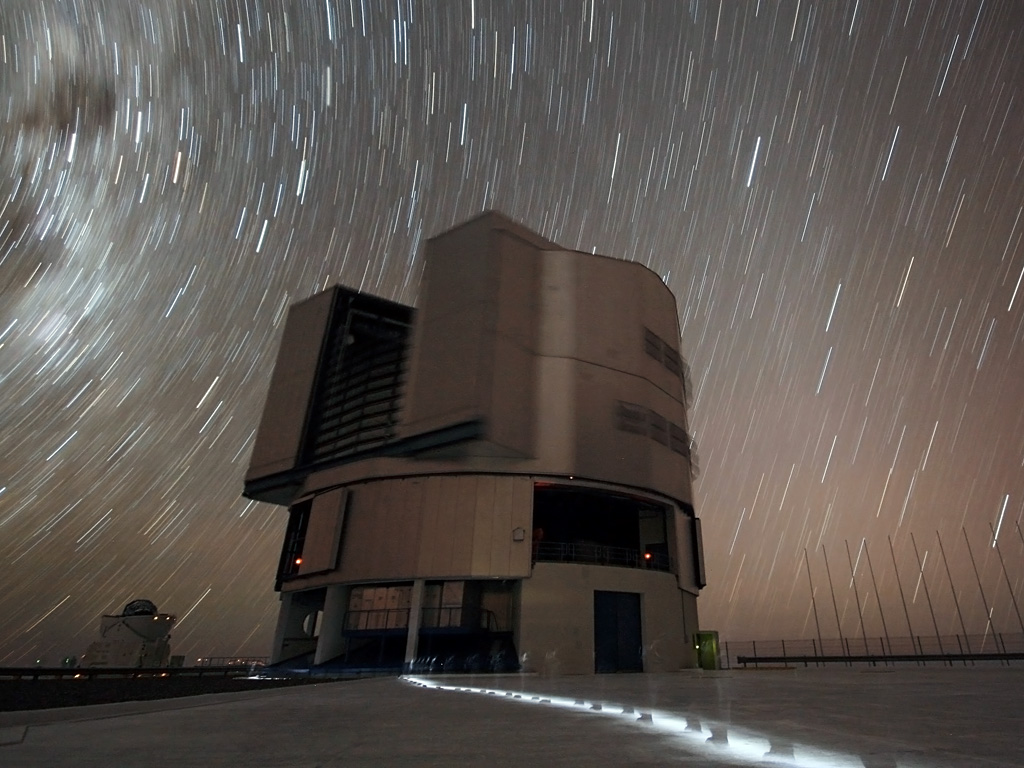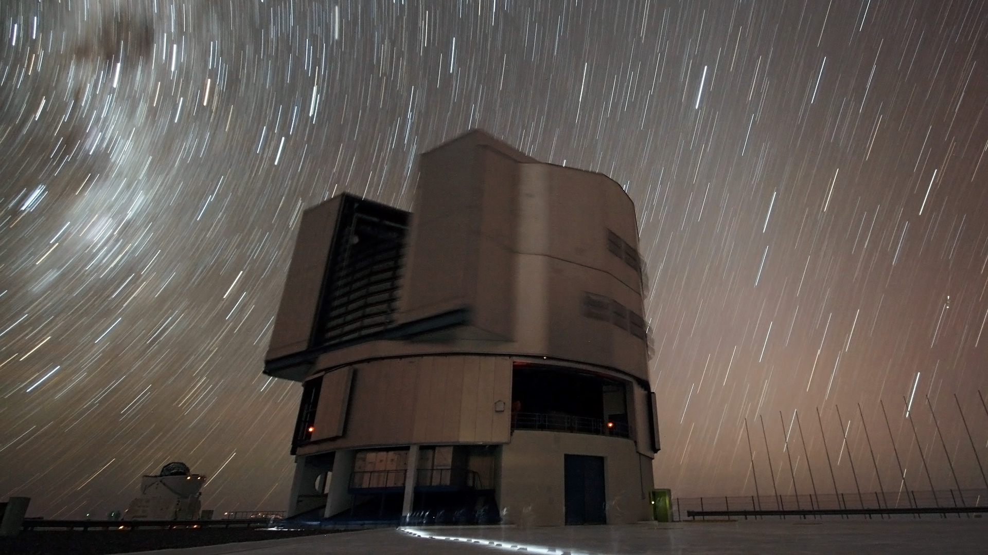 This dynamic long-exposure photograph shows ESO’s Very Large Telescope in action, as well as revealing the rotation of the Earth in space.
