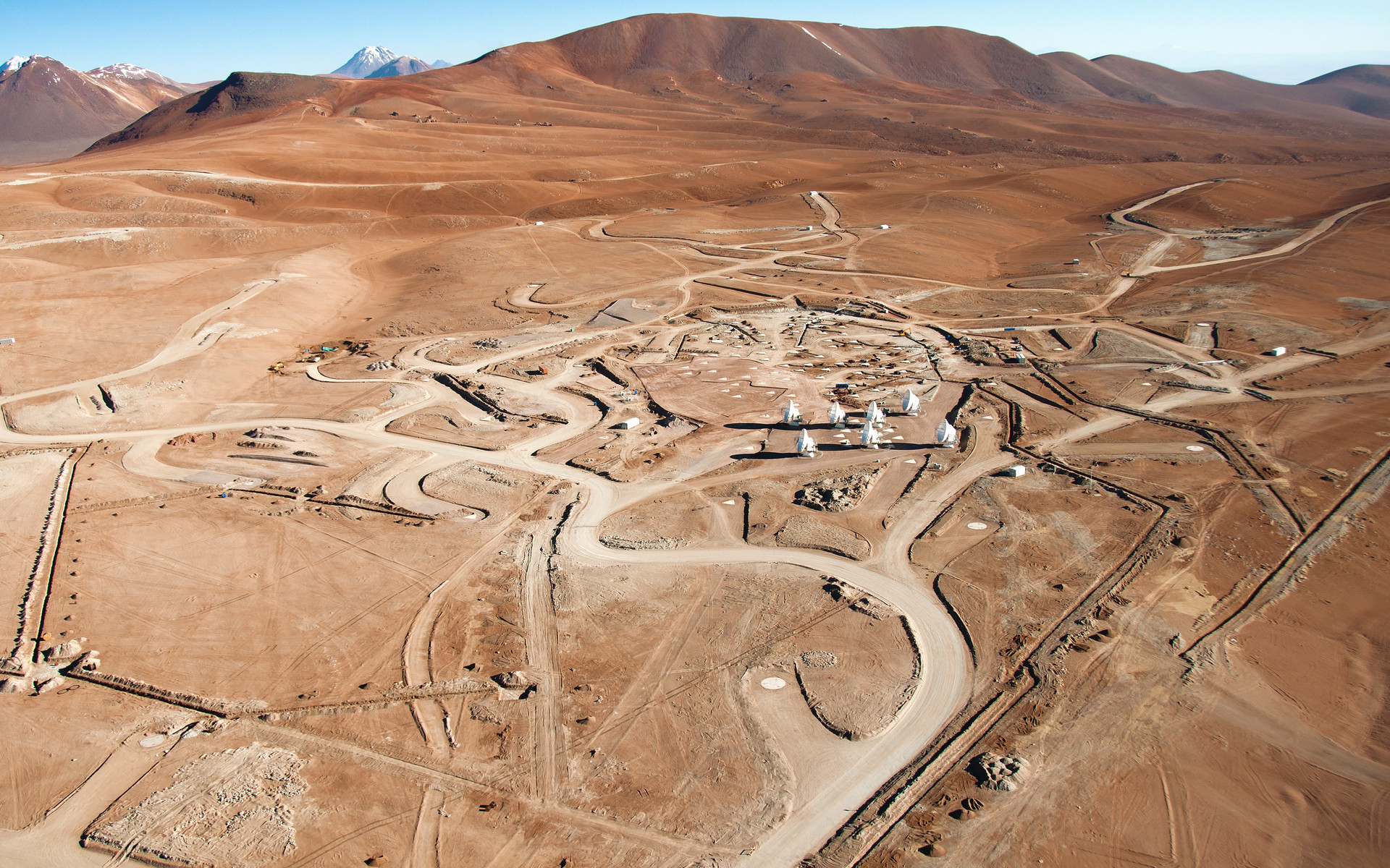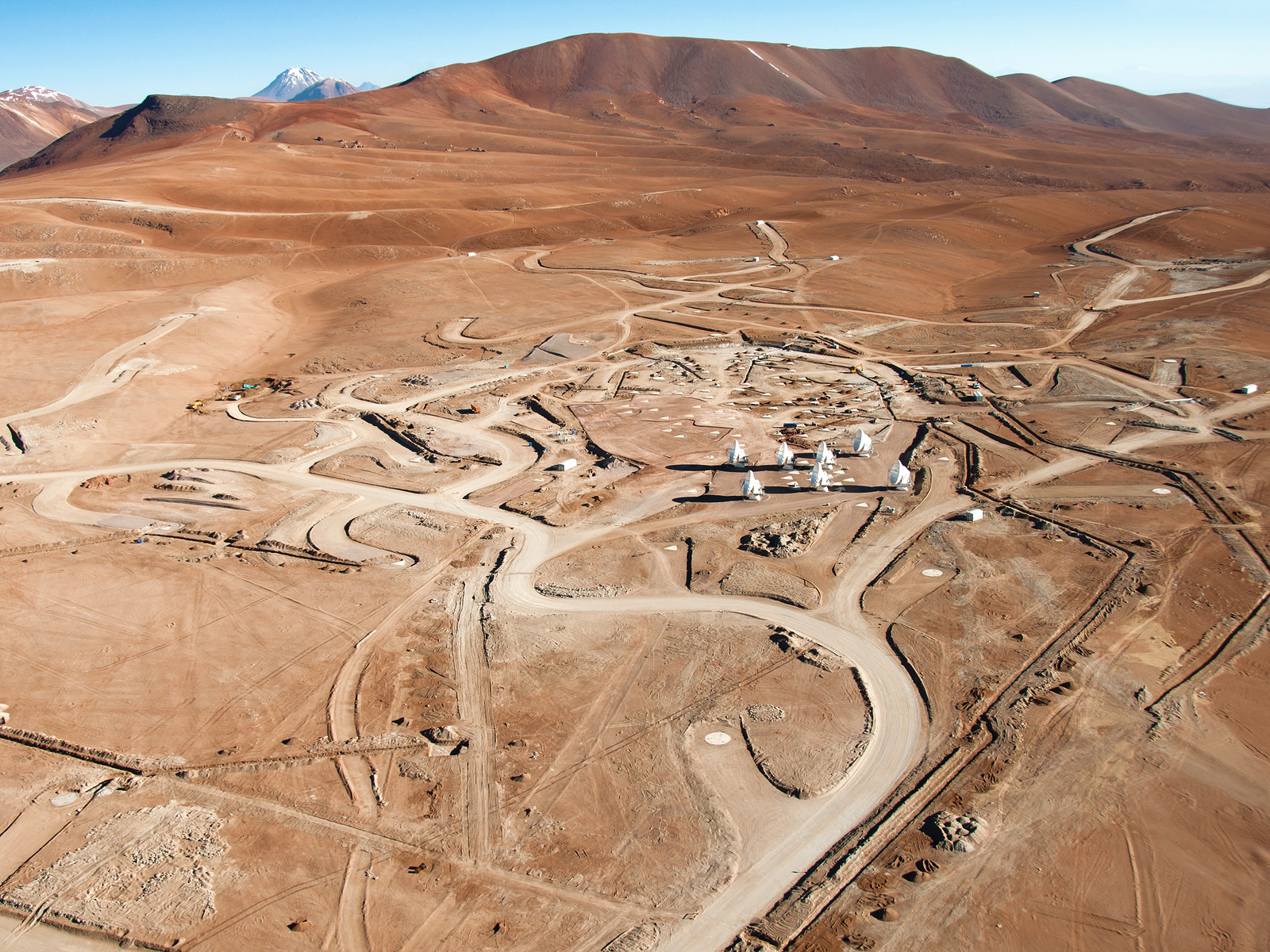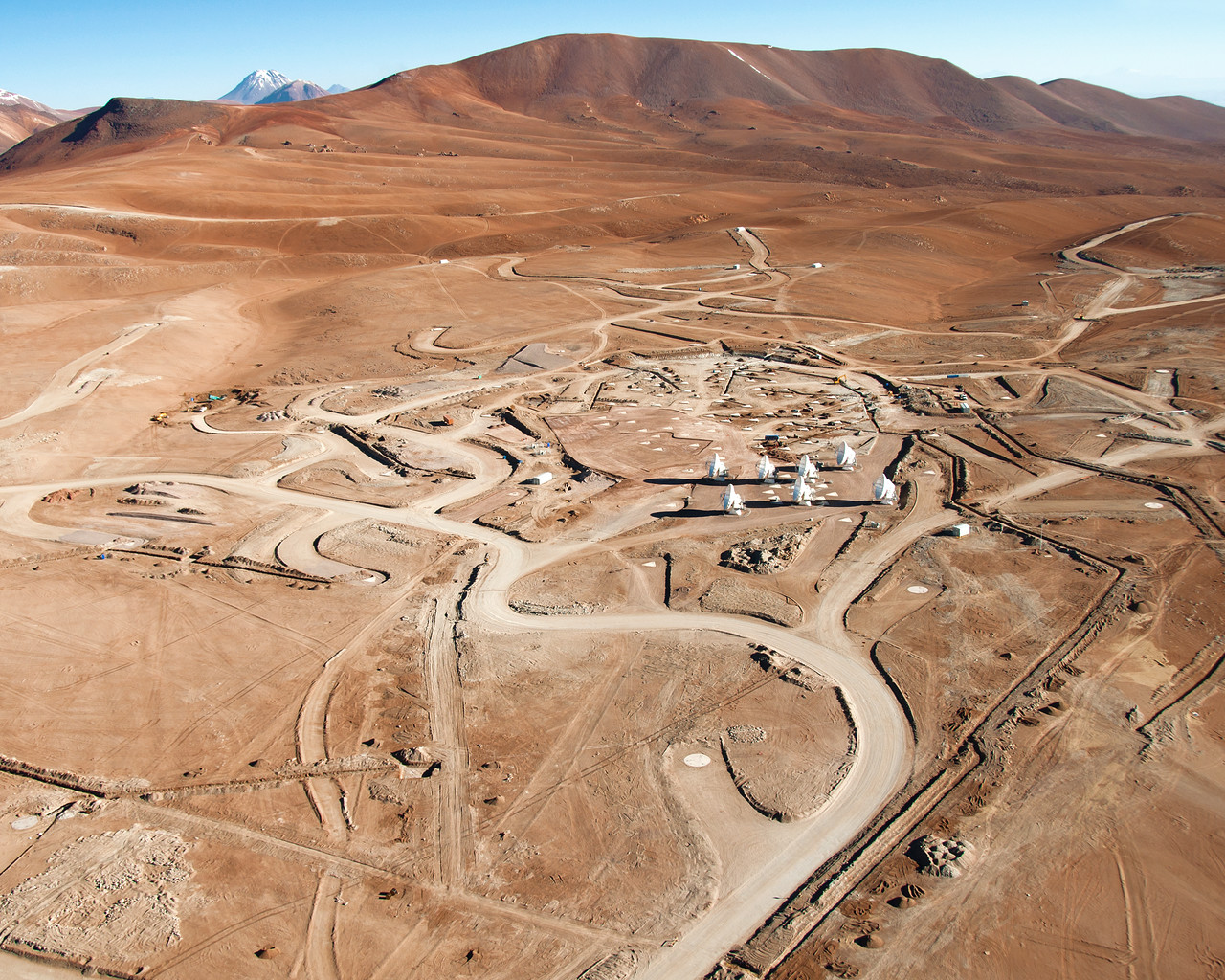 Flying south west over the 5000-metre-high Chajnantor plateau in the Chilean Andes gives an impressive view of the construction on the ALMA Array Operations Site (AOS). Besides the growing number of antennas, the roads along which the antennas themselves will be moved across the plateau are taking shape. The photograph was taken on 24 March 2011, and some of the antennas that had been installed at that time are visible at the centre of the picture.