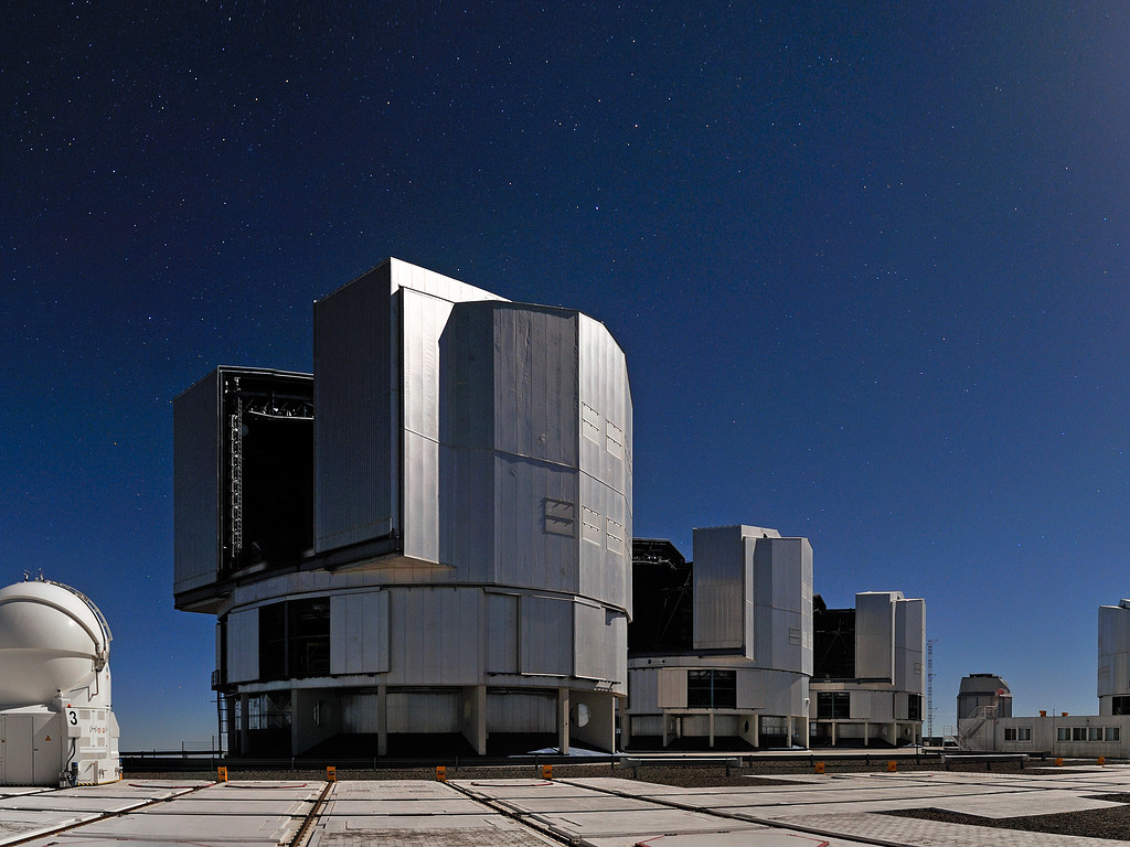 All the UTs are pointed in the same direction, at the same object, although this isn’t obvious because of the wide-angle lens used to take the photo. The light collected by each of the telescopes was then combined using an instrument called PIONIER [1]. When combined, the UTs can potentially provide an image sharpness that equals that of a telescope with a diameter of up to 130 metres.